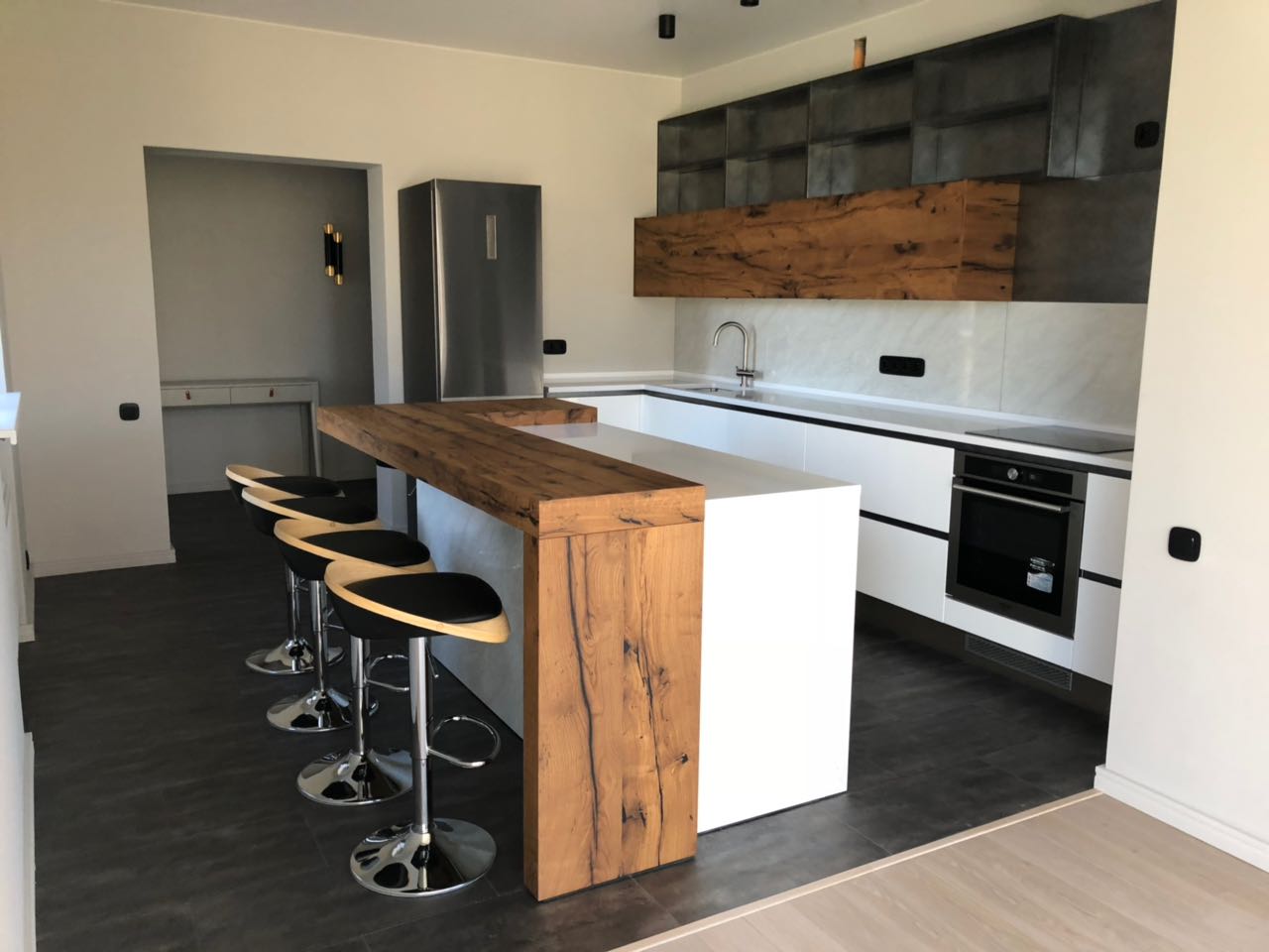 بالنسبة للمطابخ ذات المساحة المفيدة الكبيرة ، يمكن زيادة ارتفاع الشريط. غالبًا ما يتراوح ارتفاعه بين 100 و 115 سم ، وينبغي ألا يقل ارتفاع الكراسي إلى 90-95 سم.