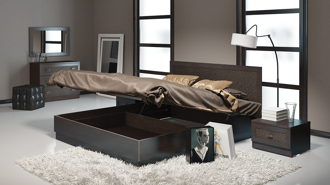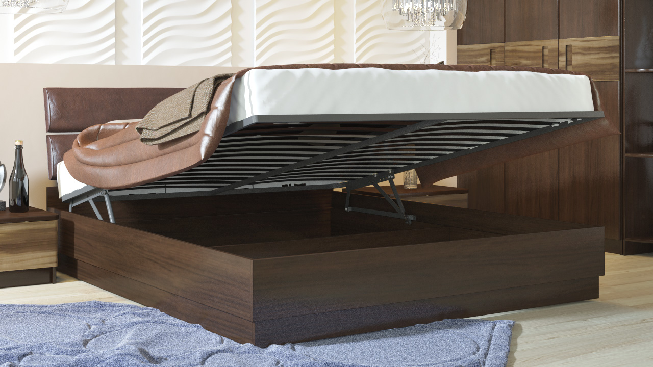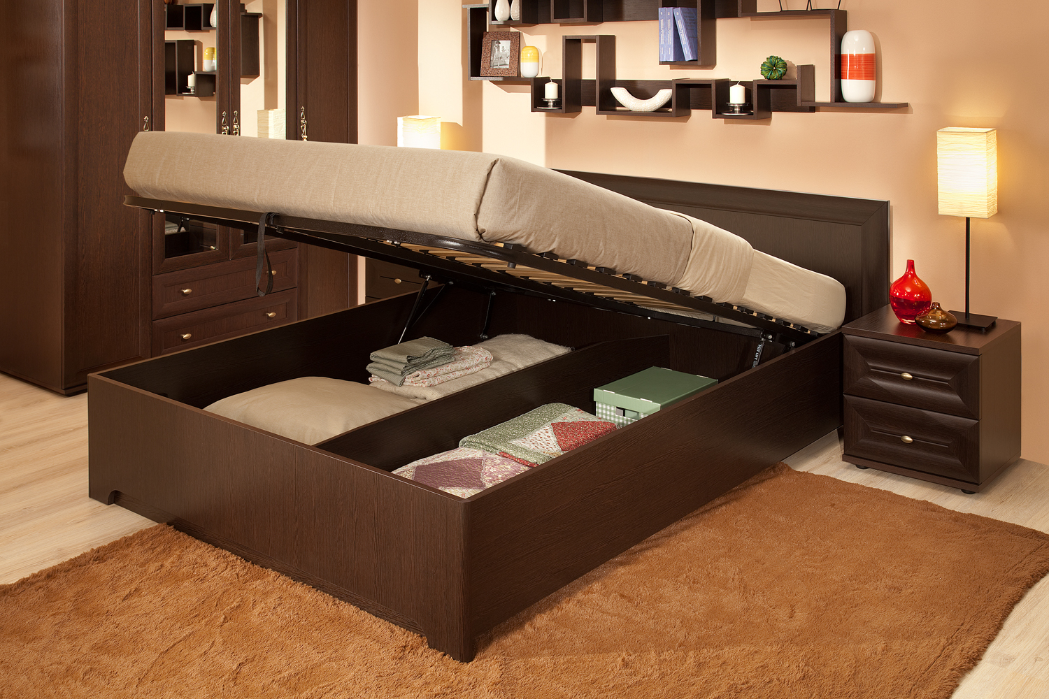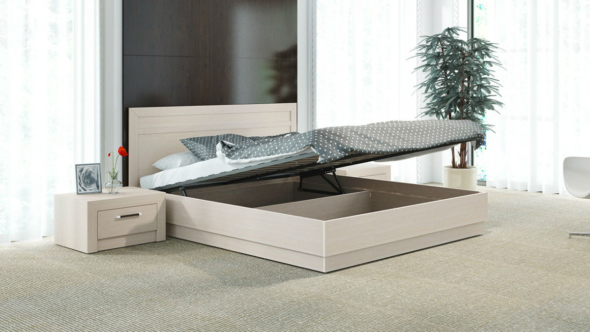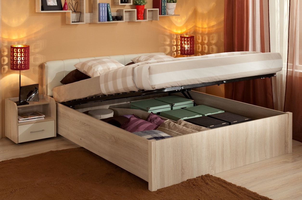 سرير مزدوج مع آلية الرفع لفترة طويلة لا يفقد شعبيته ، يتم تضمينها في تصنيف الأثاث الأكثر شعبية من قبل المستهلكين.