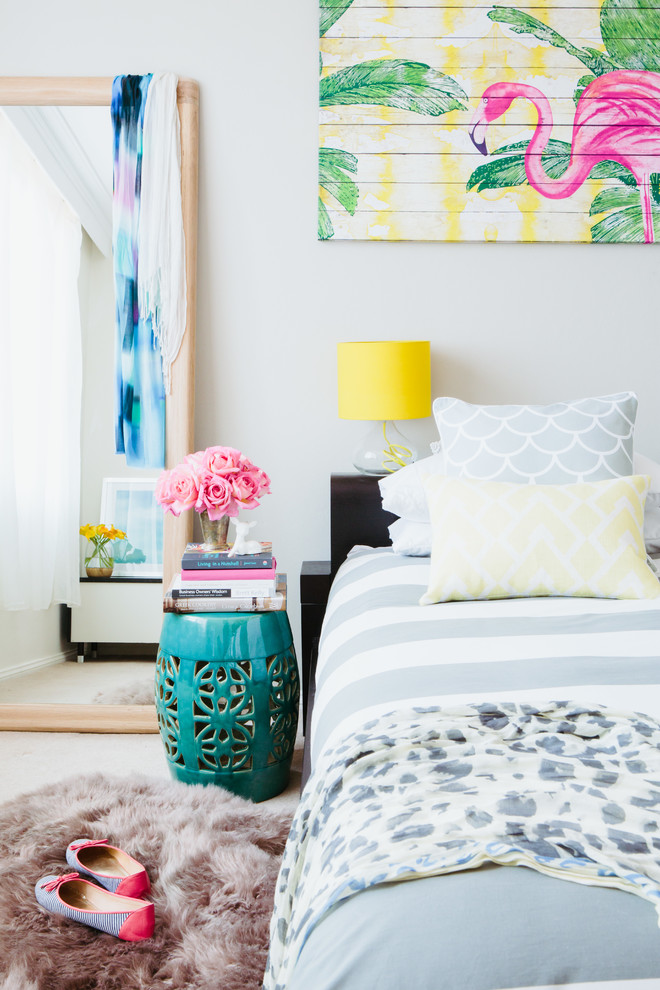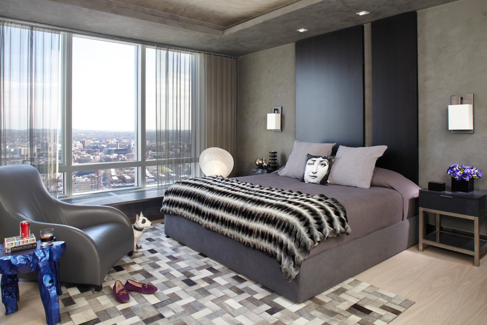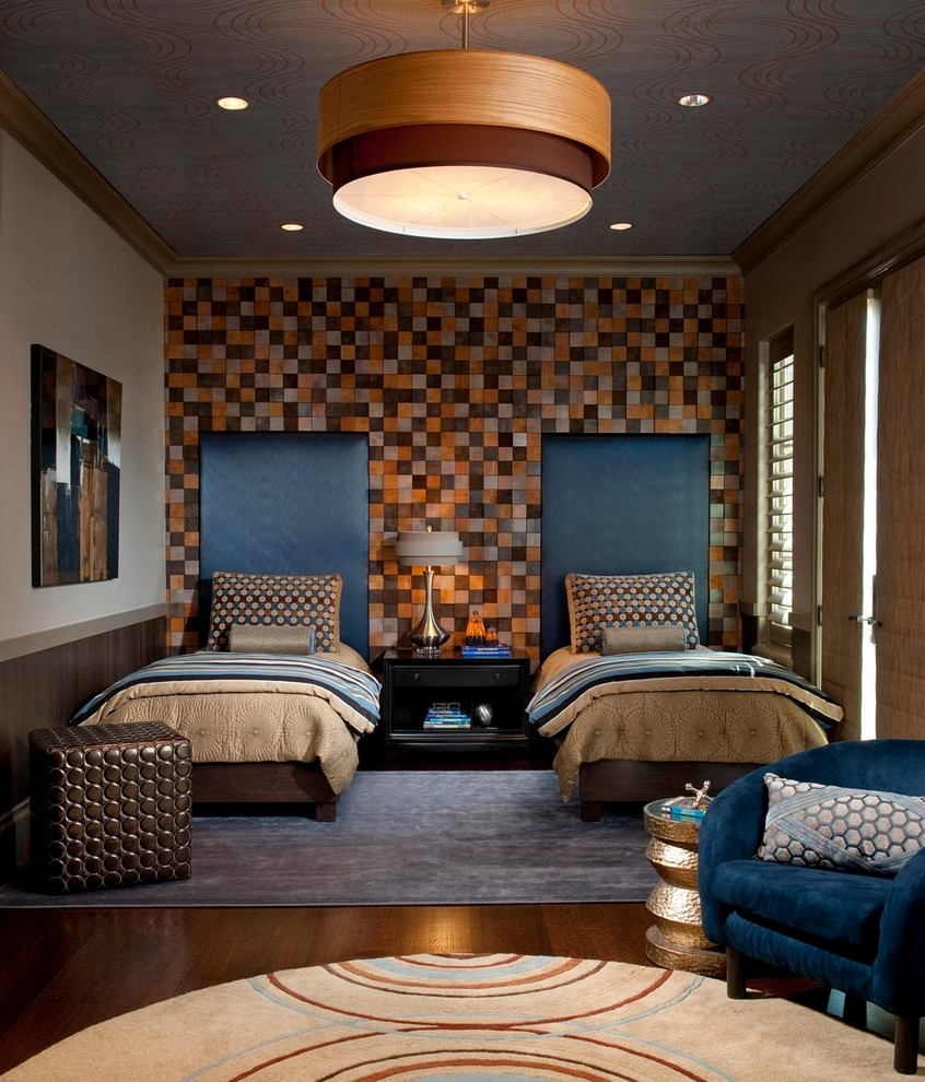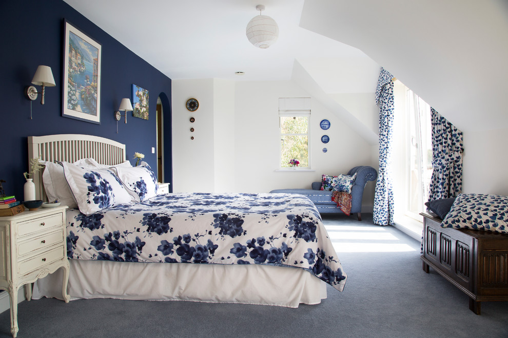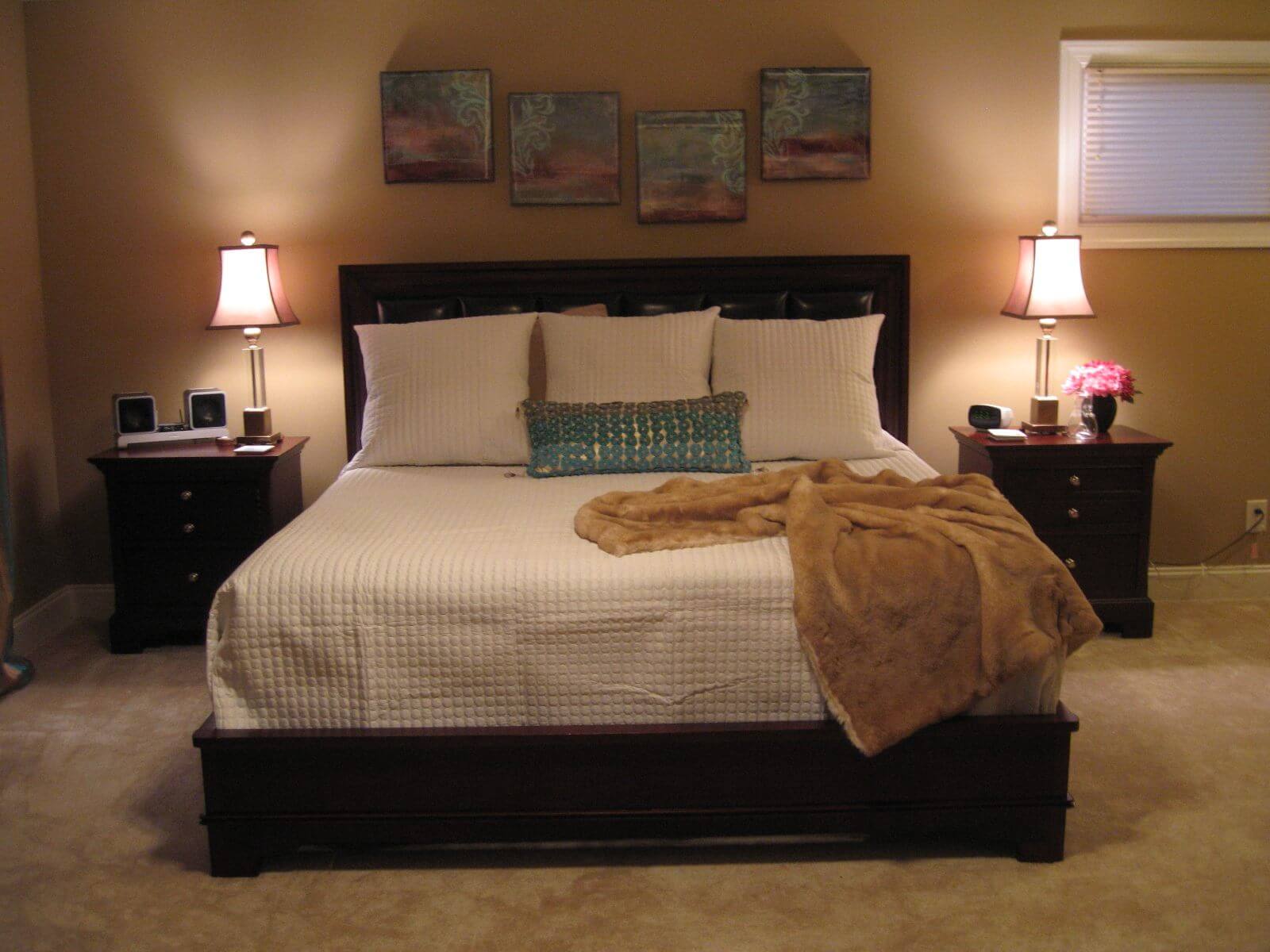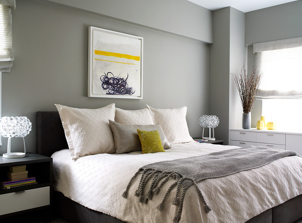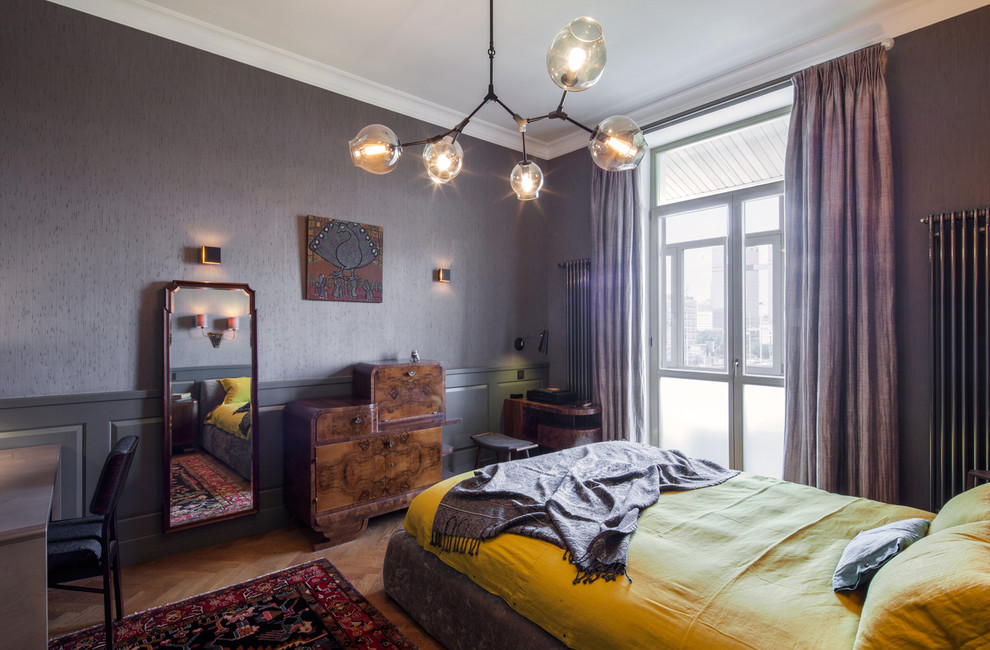 - الجدران مظلمة بالألوان ، والسرير ظلال فاتحة.