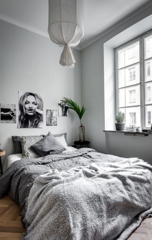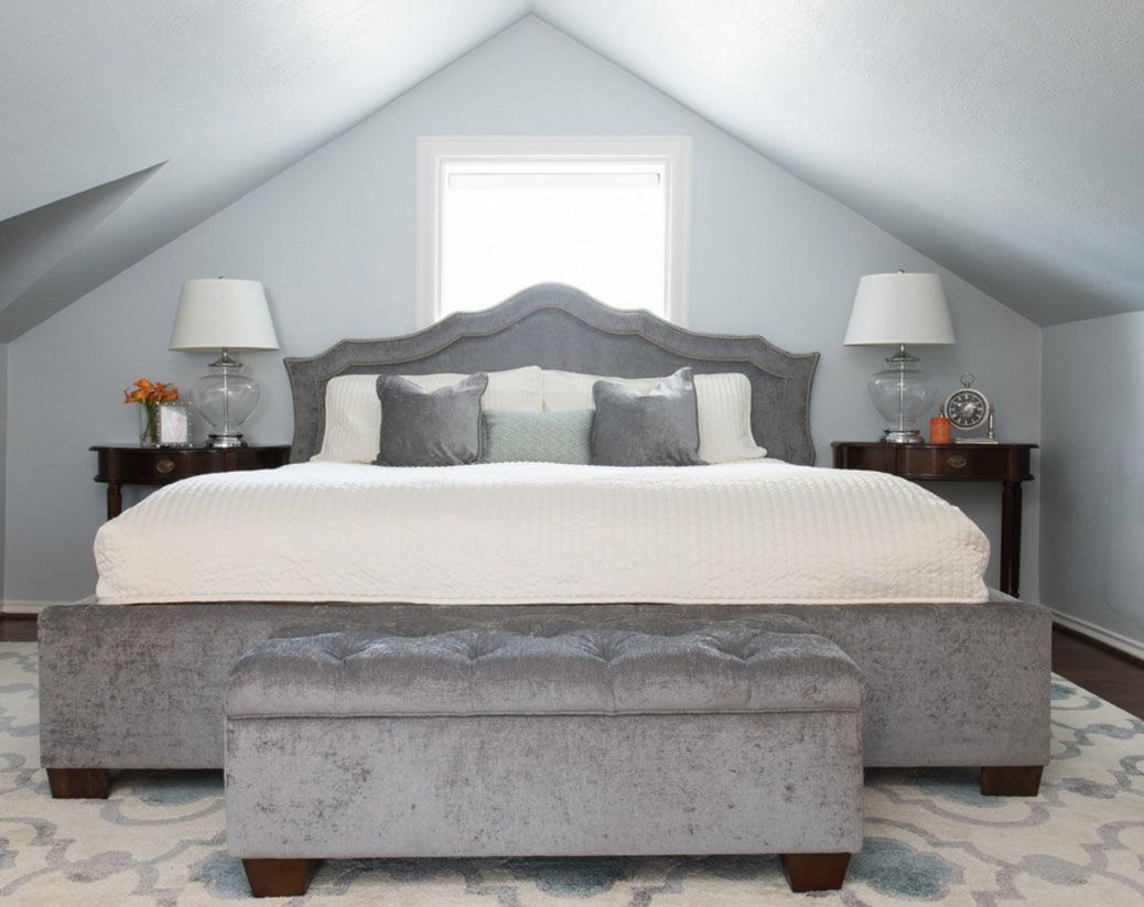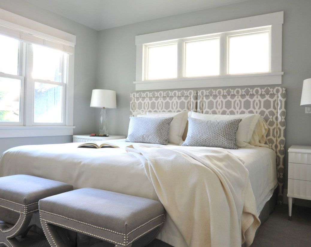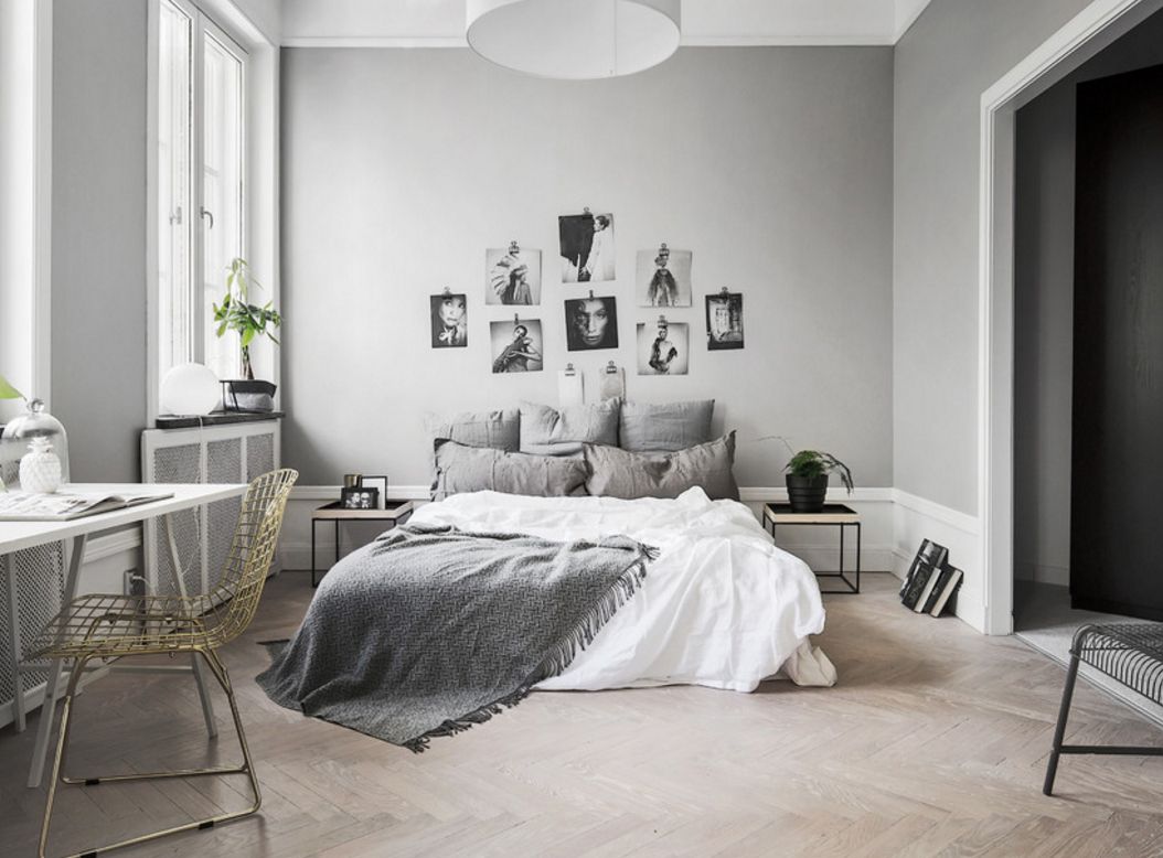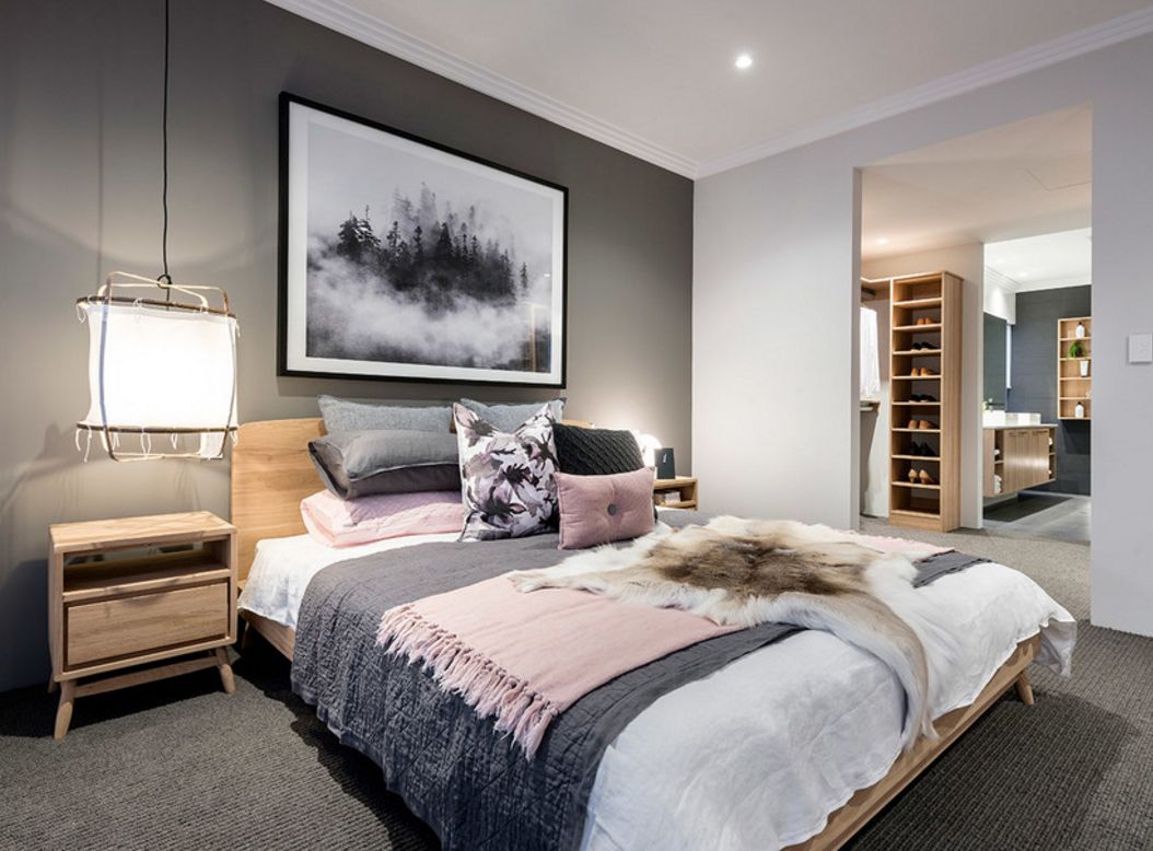 غرفة نوم مزينة في رمادي ظلال ، سيكون أفضل خلفية لللوح الأمامي الأبيض. سوف تتناغم الألوان الزاهية للجدران أيضًا مع مثل هذا الأثاث - سيخفف السرير من المساحة الداخلية الغنية.