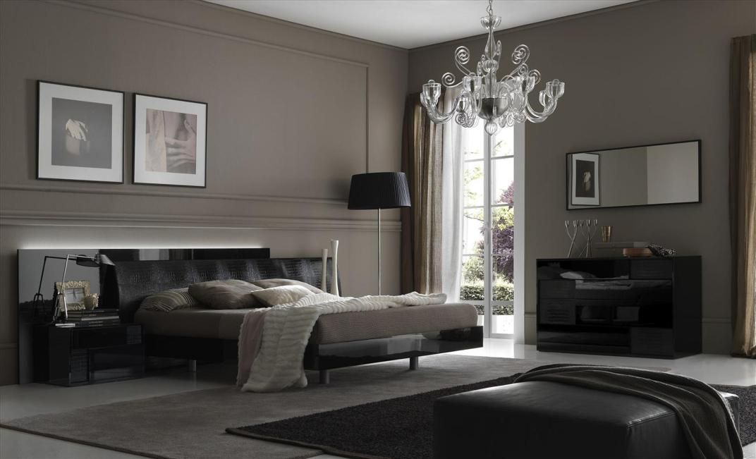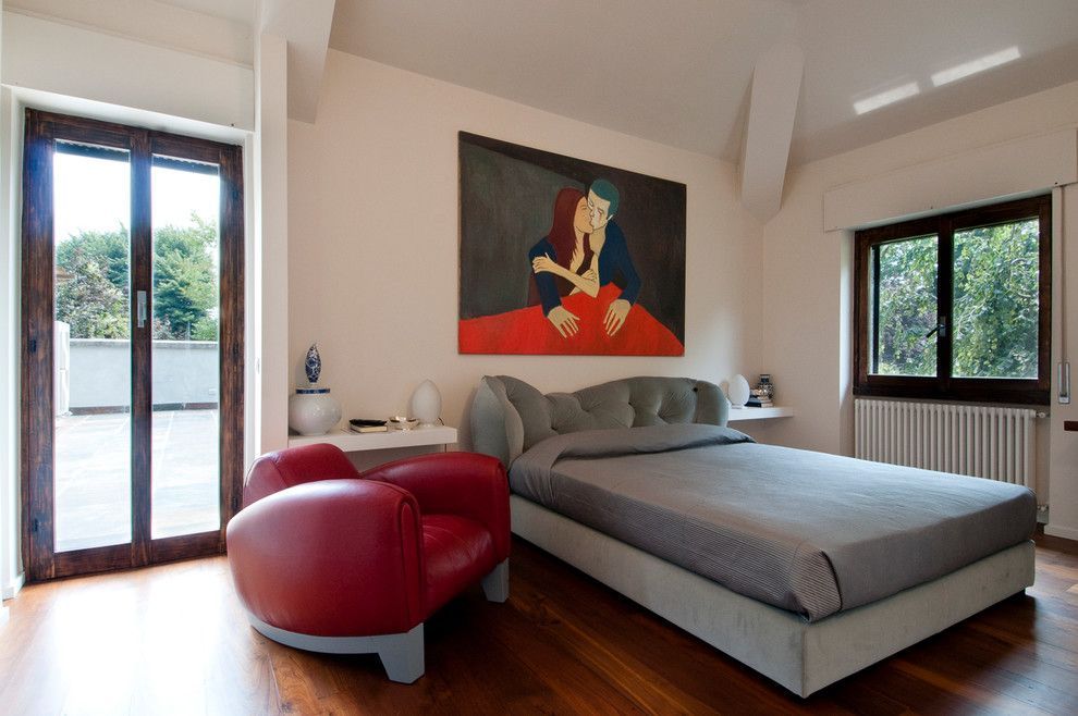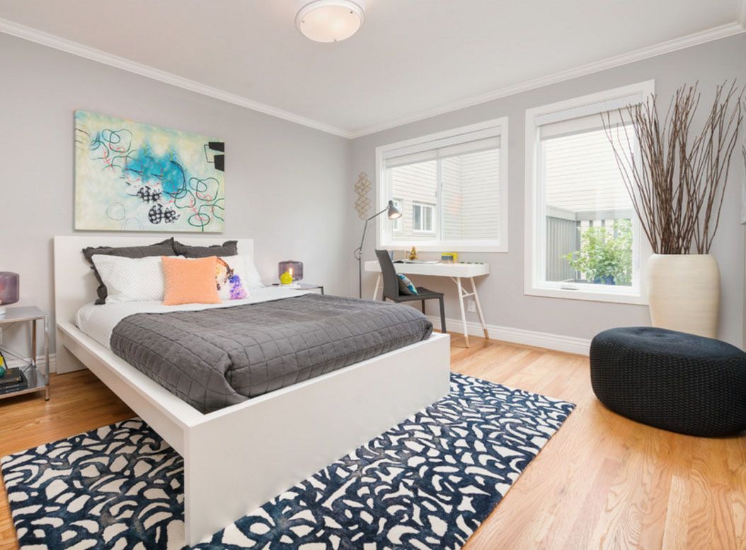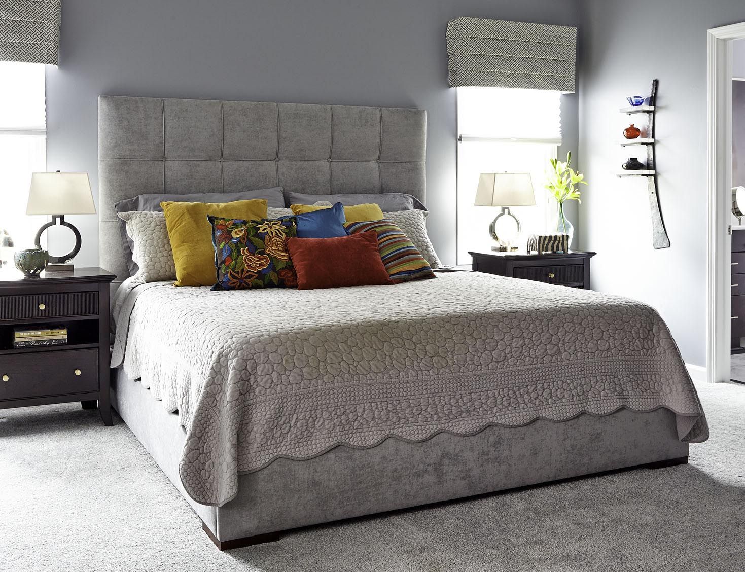 غرفة نوم مزينة في رمادي ظلال ، سيكون أفضل خلفية لللوح الأمامي الأبيض. سوف تتناغم الألوان الزاهية للجدران أيضًا مع مثل هذا الأثاث - سيخفف السرير من المساحة الداخلية الغنية.