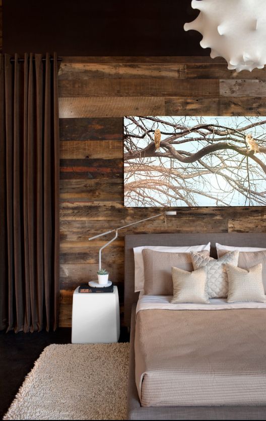 سوف يمنح الظهر الخشبي الغرفة الراحة والراحة البيئية. إذا كنت تستخدم الخشب غير المعالج ، أو قم بتعميقه بنفسك ، فسيكون التصميم الداخلي العصري أنيقًا بالفعل. دون علاج لوحة يحسب على نحو فعال مع الجدار ، قلصت تحت لبنة.