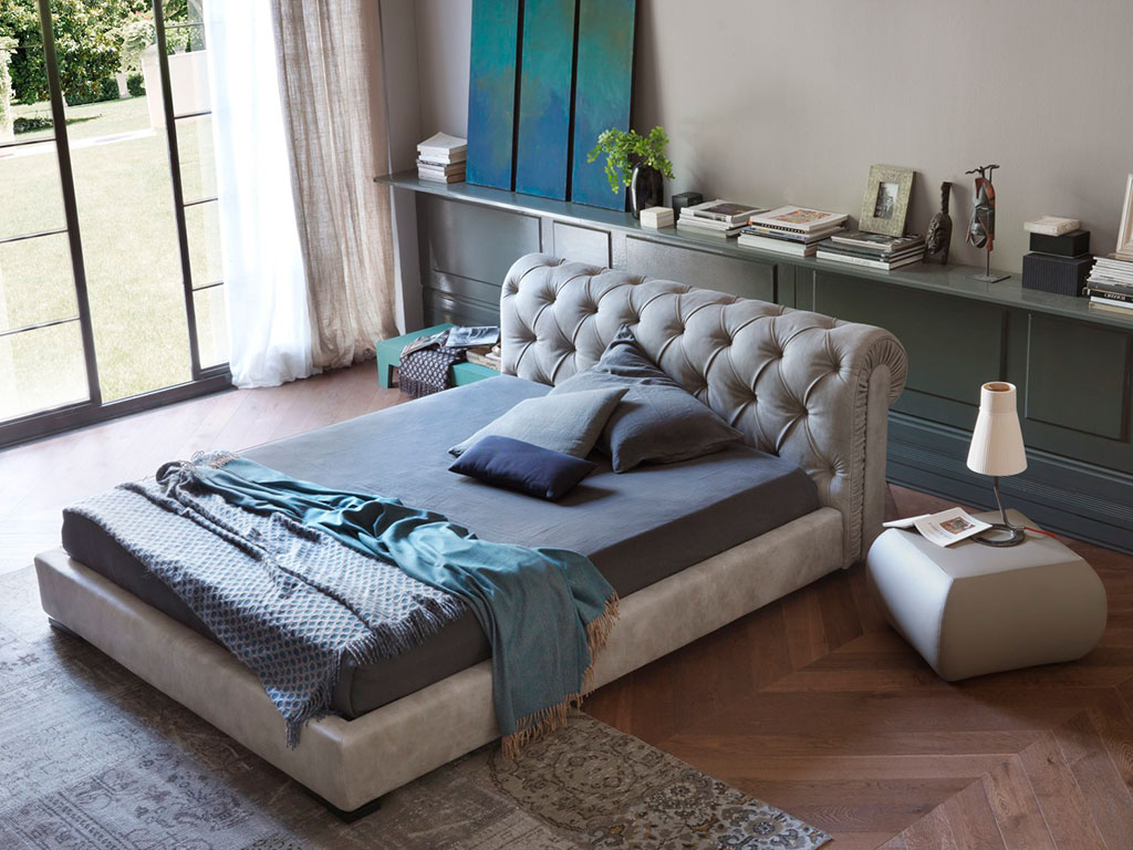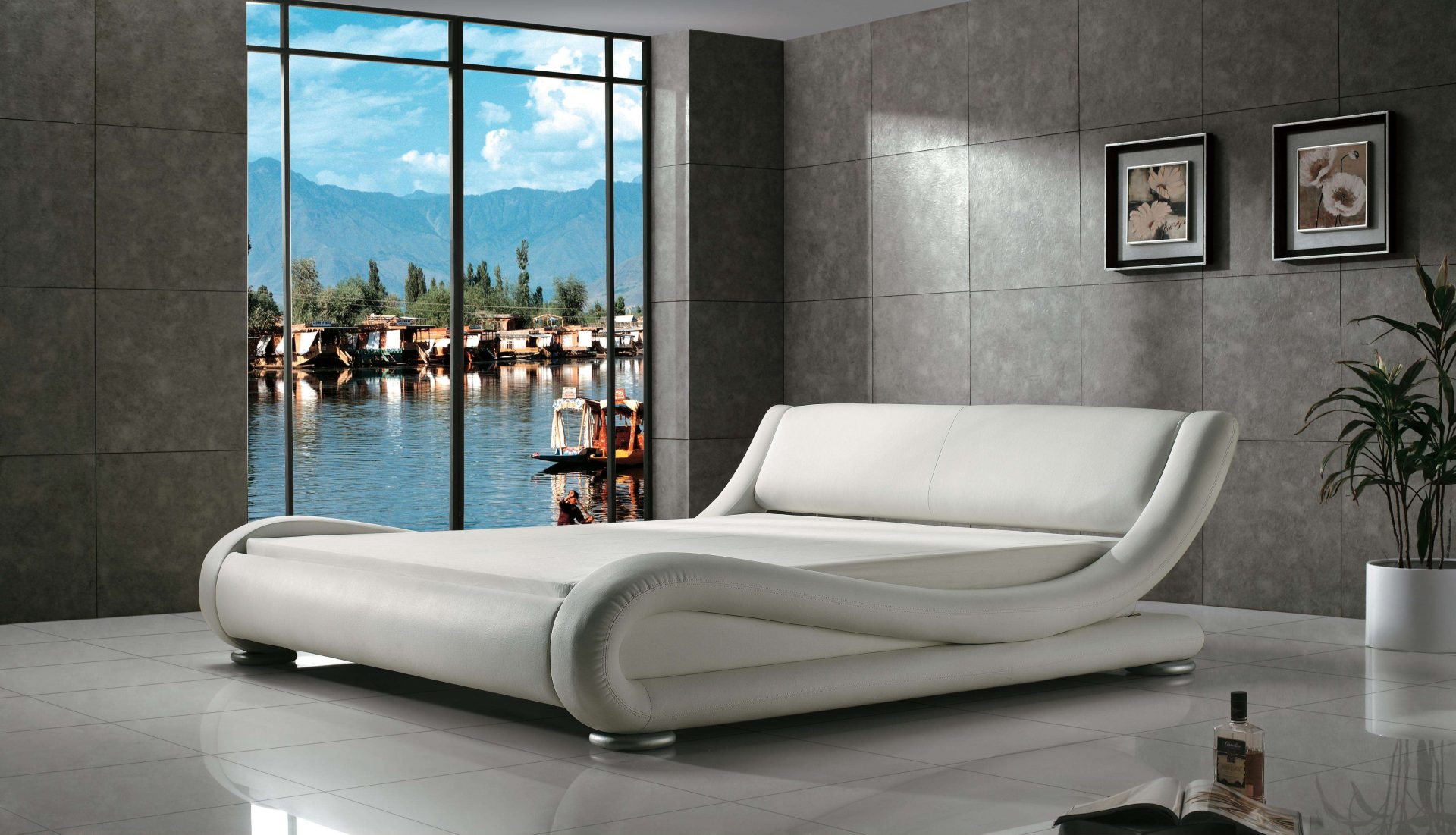 سرير من الجلد الأبيض - أحد أفخم الموديلات ، والذي سيكون إضافة رائعة للديكور الداخلي الكلاسيكي.