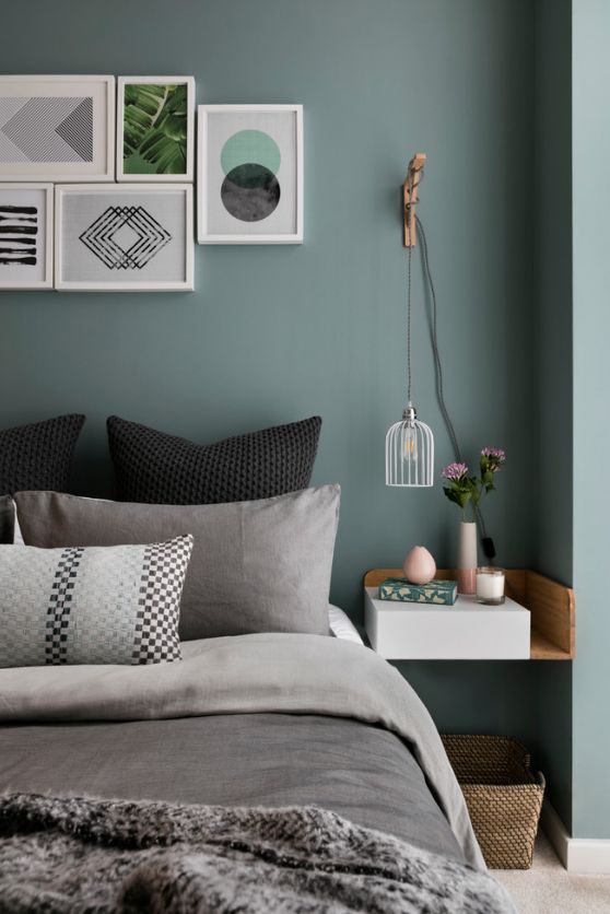 على جدار جامد وعالي ، يمكنك ترتيب الرفوف أو الوقايات. هذا مثالي لغرفة نوم صغيرة لا تناسب طاولات السرير. ضع مصابيح ليلية أو كتب أو مزهريات على هذه الأرفف.