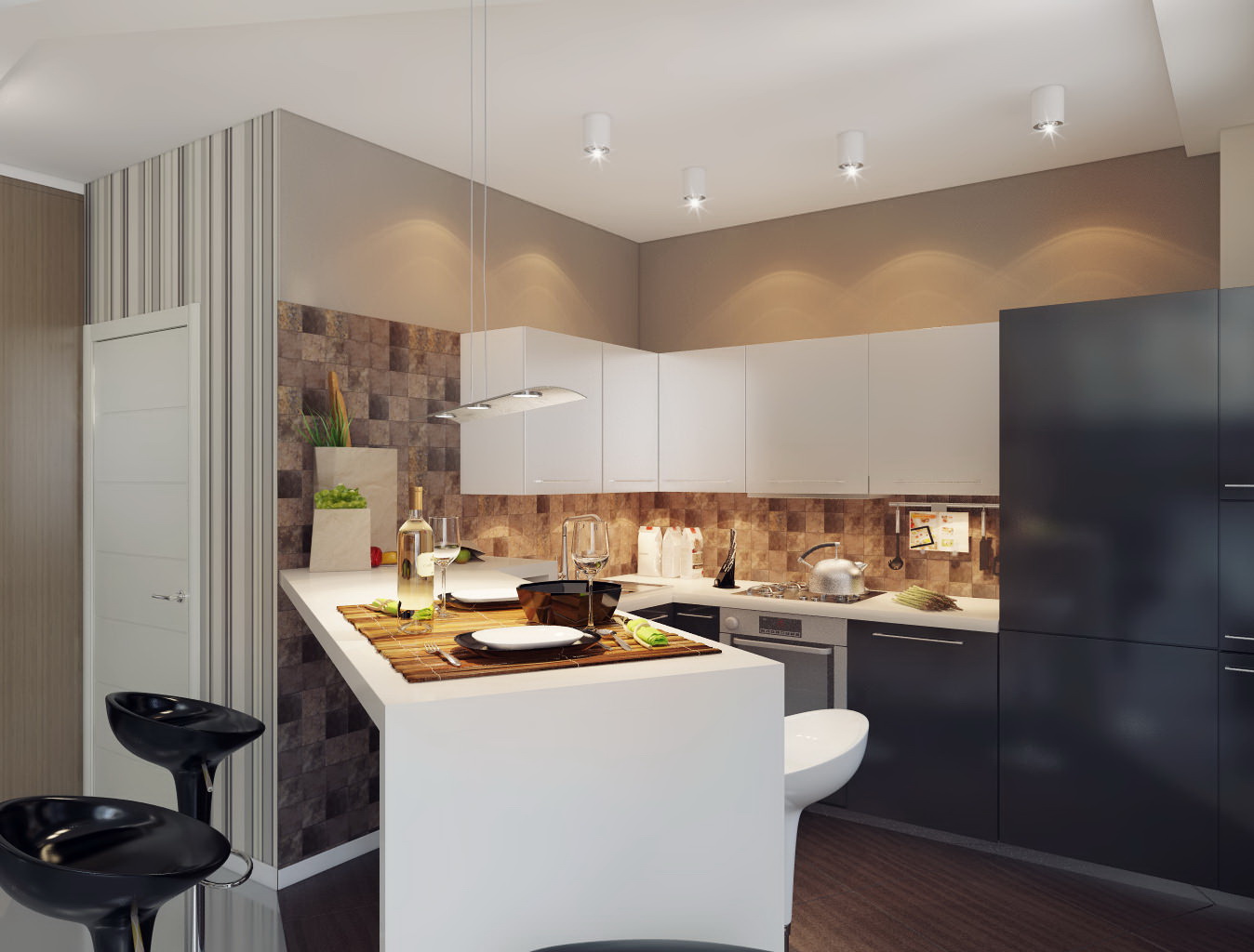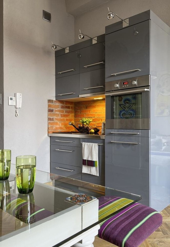 في مساحة صغيرة خالية ، متوفرة في الزاوية ، يمكنك وضع أريكة صغيرة وأثاث لتخزين أدوات المائدة. البساطة تضمن نظرة حديثة في أي شقة صغيرة.