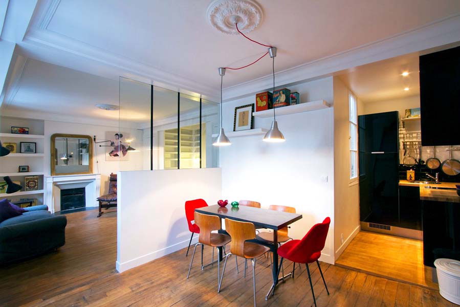 تستخدم هذه الشقة التي تبلغ مساحتها 32 مترًا مربعًا جدرانًا زجاجية داخلية لإنشاء غرفة نوم لا تجعل المنزل أصغر بصريًا. منطقة صغيرة لتناول الطعام مع كراسي مرقعة على طراز منتصف القرن مناسبة لضيف أو ضيفين.