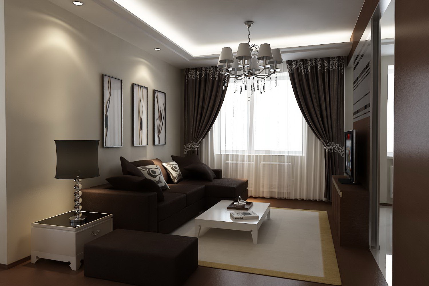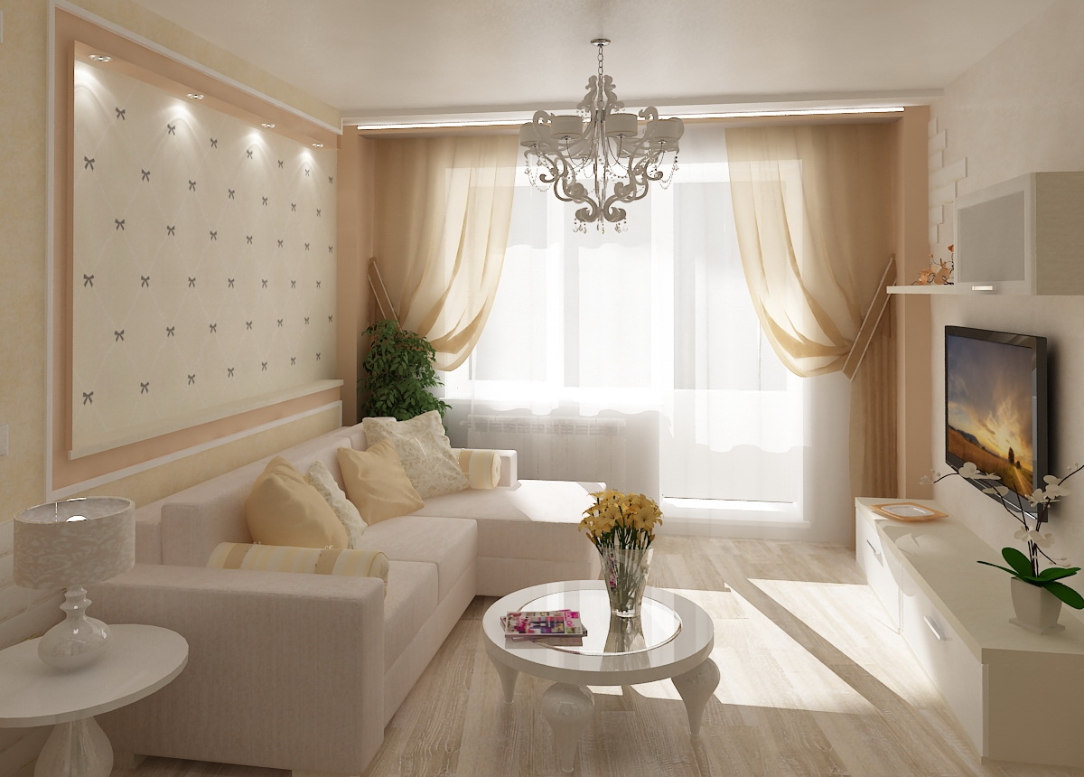 تصميم التصميم في شكل تقليدي. يشتمل الأثاث على سرير أريكة بحجم مناسب وكرسي سهل وطاولة قهوة وطاولة قاعدة وحامل تلفزيون. قم بتأمين مساحتك باستخدام سجادة كبيرة ، على سبيل المثال ، سجادة بحجم 2.5 × 3 أمتار. إذا كان لديك جهاز تلفزيون ، ابحث عن أفضل مكان لمشاهدته من جميع الجهات وابدأ تصميمك بوضع التلفزيون.