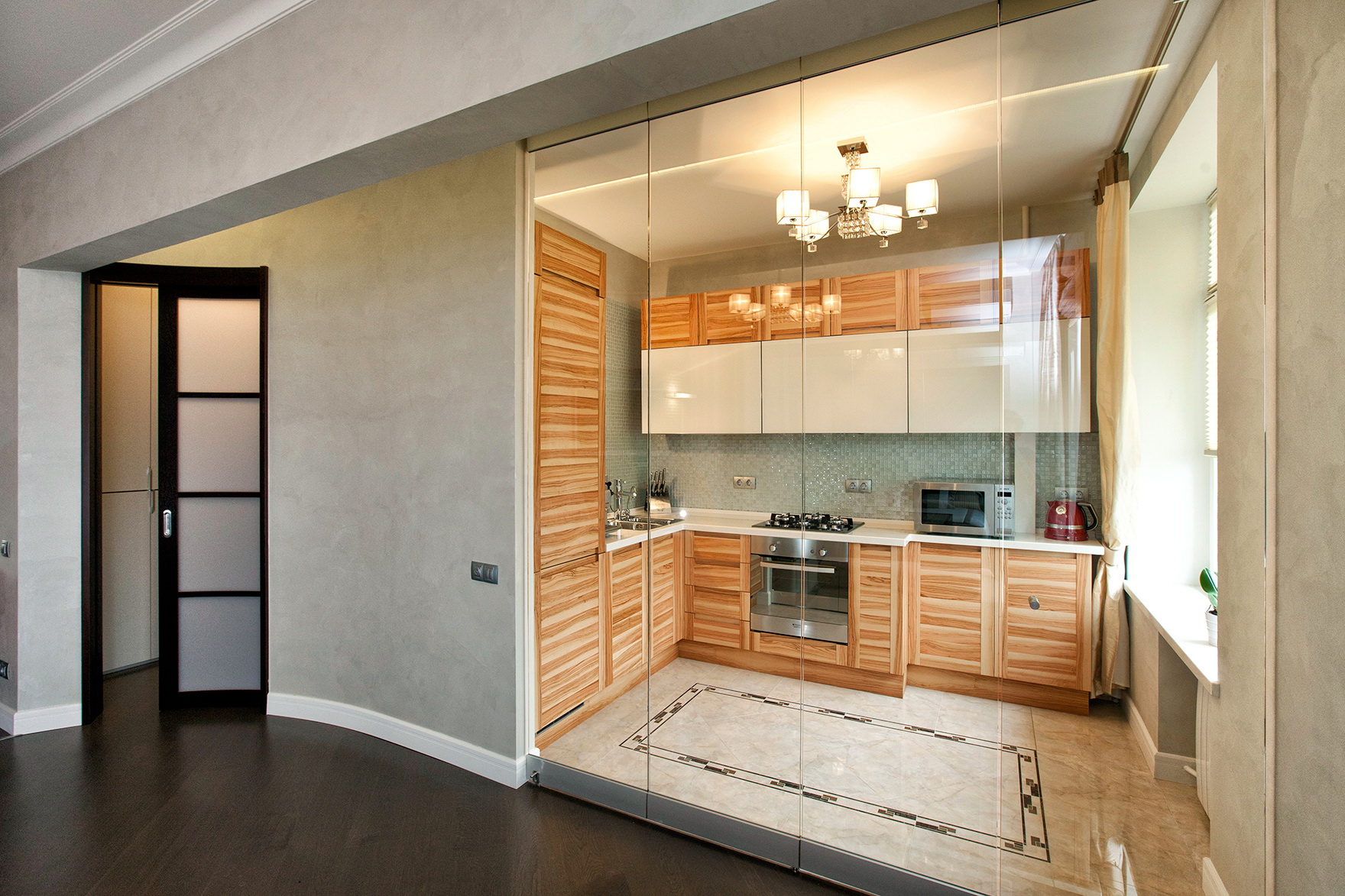 علاوة على ذلك ، يمكن للزجاج تكبير المساحة بصريًا (وهذا لا ينطبق فقط على المرايا) ، بالإضافة إلى وظائفها. سيبدو هذا الجزء الداخلي مرنًا وعمليًا ، وسيوفر حقًا ، وسيبدو جميلًا ومريحًا.