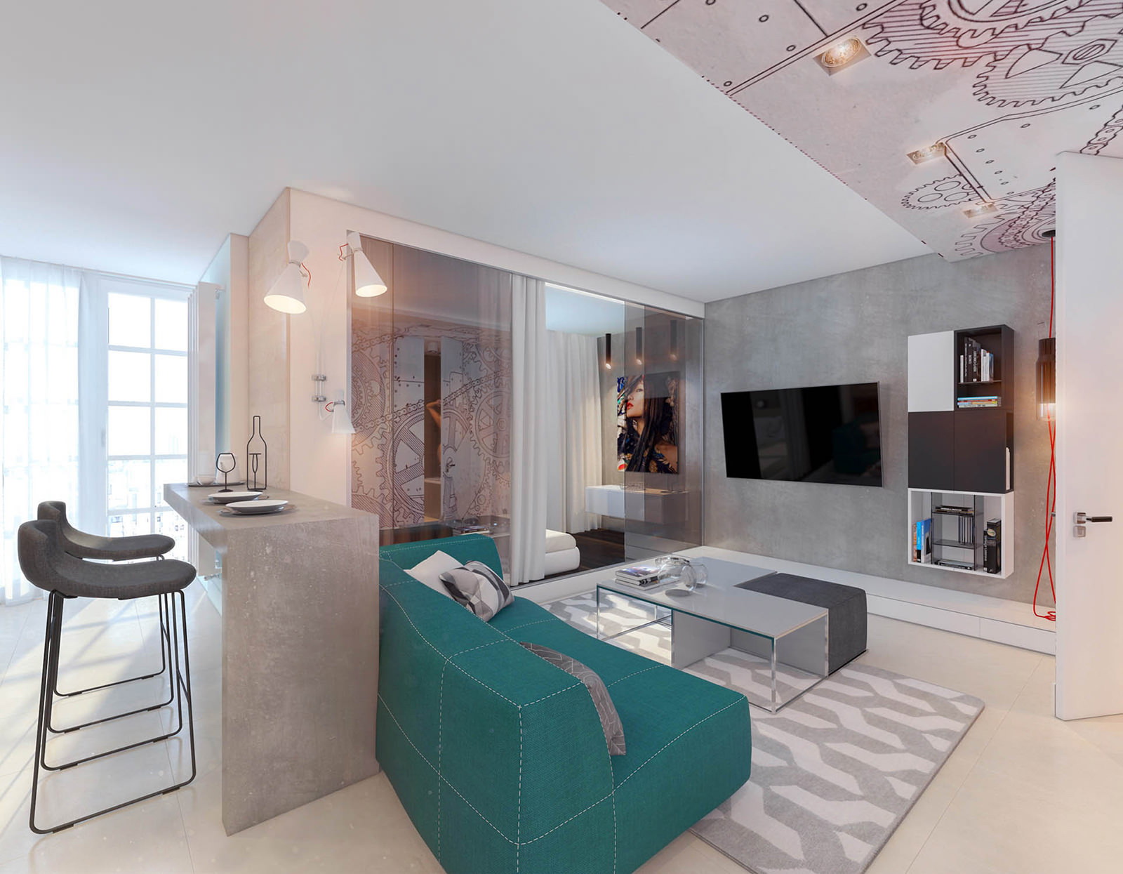 لا يمتص الزجاج المساحة ، وهذا هو الشيء الرئيسي الذي نريد تحقيقه - الحد الأقصى للمساحة المفتوحة. لذلك لا تتردد في استخدام الأقسام الزجاجية في التصميم الخاص بك لتحقيق تقسيم المناطق الفعال.