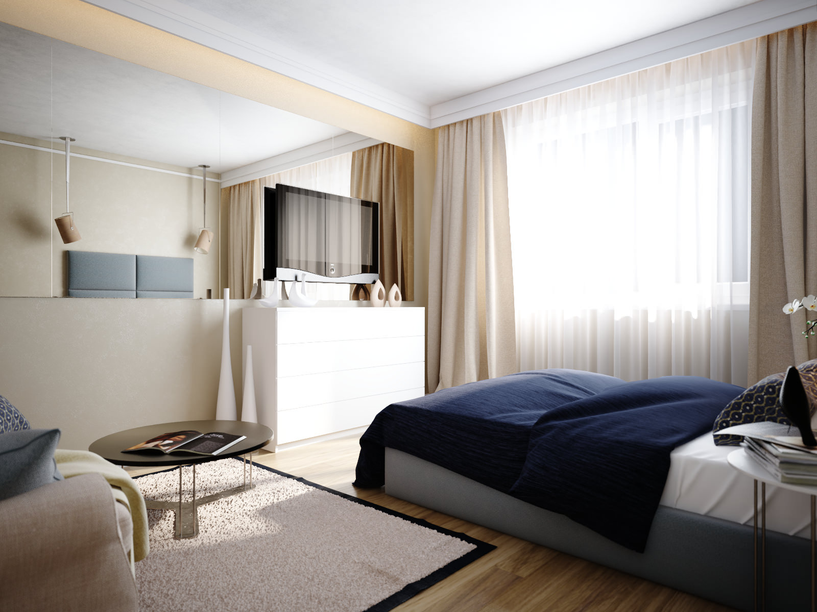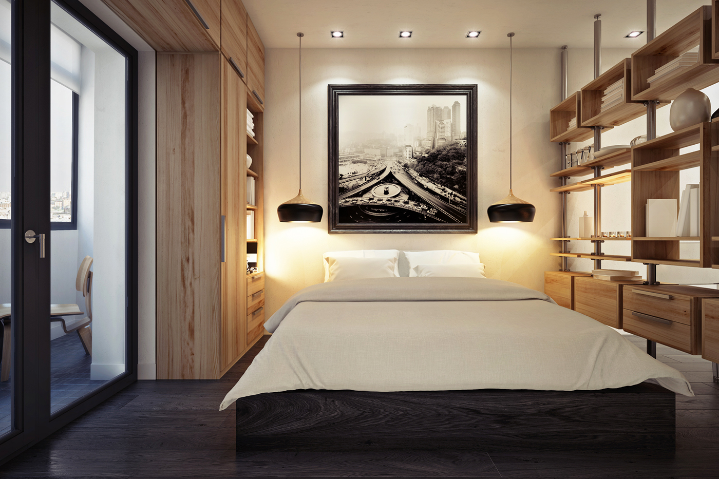 غرفة النوم صغيرة ، لكن النوافذ الكبيرة لا تسمح لها بالشعور بالإغلاق. يؤدي الحامل وظيفة مزدوجة: مثل اللوح الأمامي والتخزين ، مما يضيف الاهتمام وبعض التخزين المفيد.