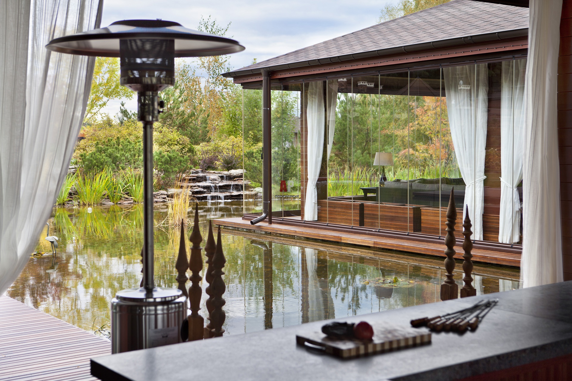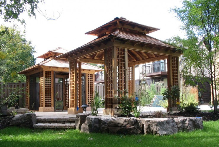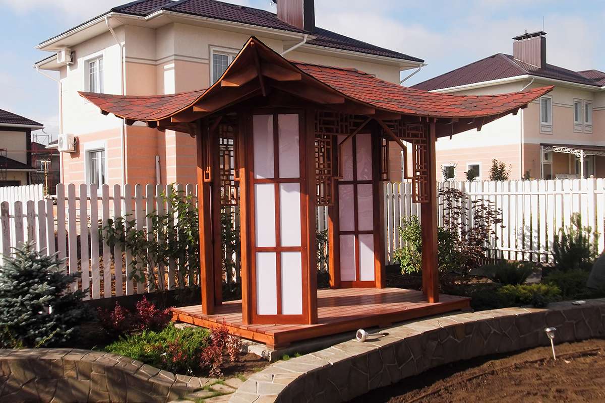 - شكل البناء. فتح أو نصف مفتوحة. شرفات المراقبة المغلقة في اليابان لا. ولكن ، إذا كنت حارًا جدًا في فصل الصيف ، فيمكنك تزويد الهيكل بألواح ستائر تقليد الورق. يمكنك رسمها بالهيروغليفية.