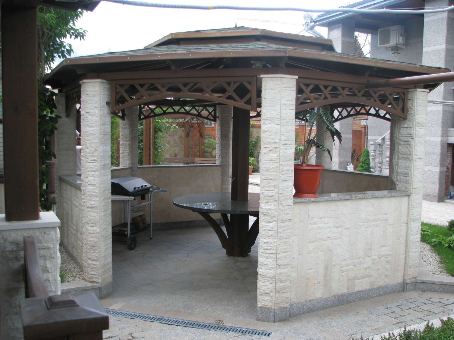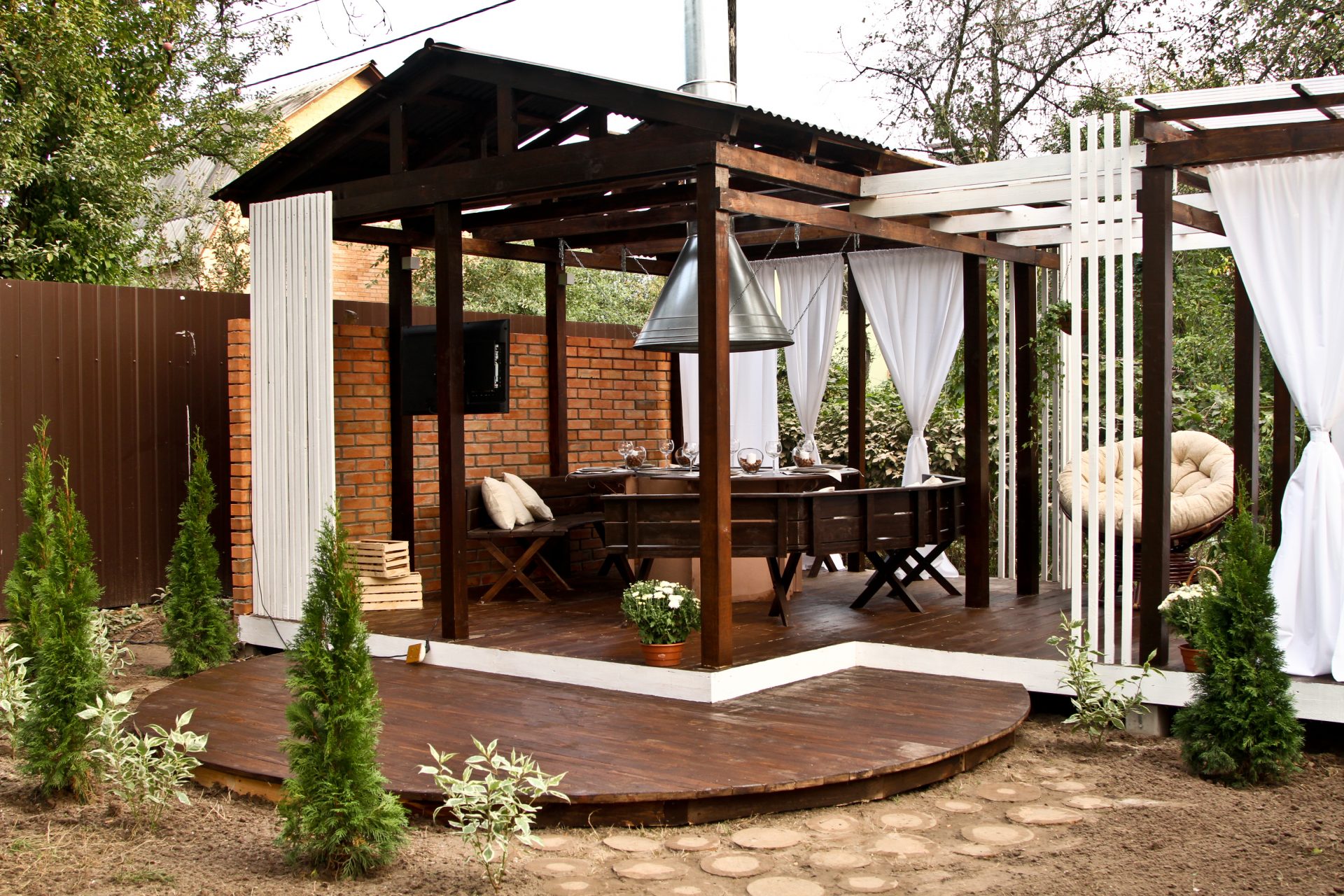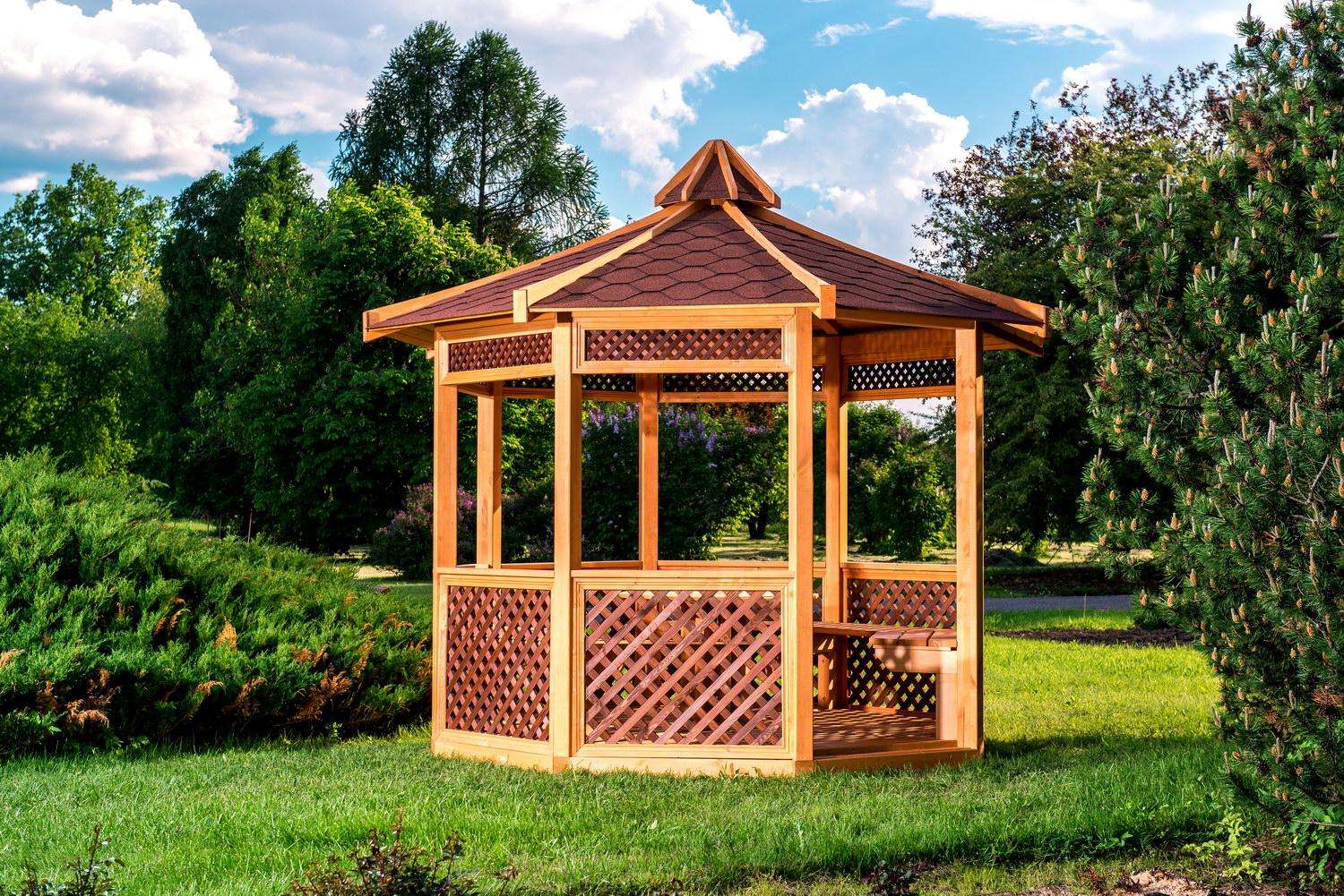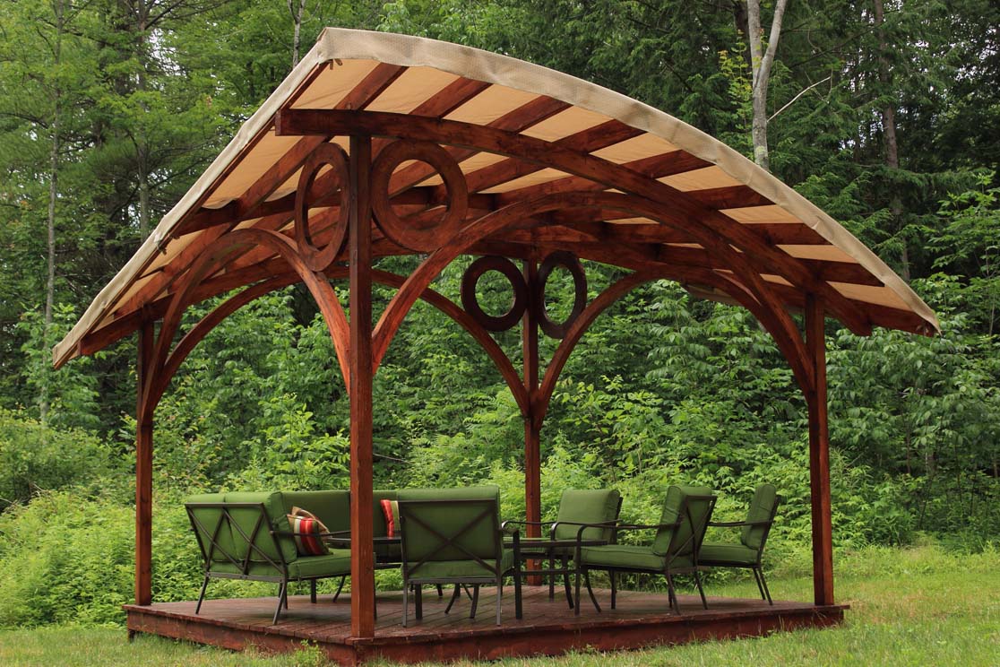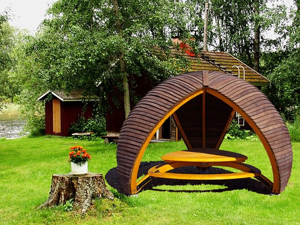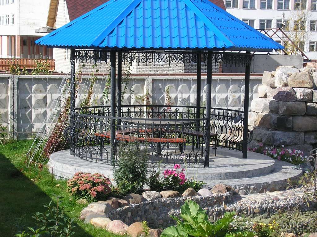- جولة. هذه الأكشاك نادرة نسبيًا ، حيث يصعب صنعها. أنها تبدو ، ومع ذلك ، مذهلة ، والمثير للاهتمام ، وجذب الانتباه. تبدو جيدة بشكل خاص إذا كان السقف مصنوعًا على شكل نصف كرة.