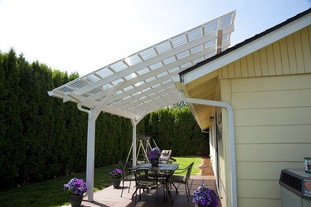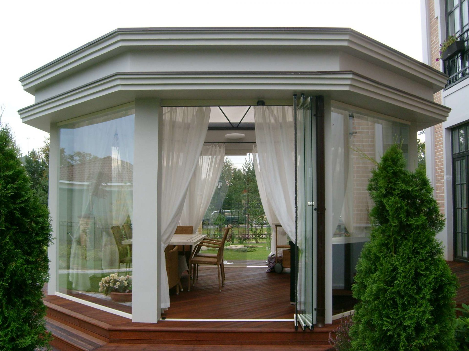 - فتح. هم في الواقع سقف على عدة أعمدة. تبدو لطيفة للغاية ومثيرة للاهتمام وفسيحة ، حيث تتيح لك مزج بصري داخل الشرفة بالحديقة الموجودة بالخارج. في فصل الصيف في مثل هذا الشجرة يكون الجو بارداً ، لأن الرياح تدخل فيه ، وحتى أثناء المطر يكون الجو جافًا ومريحًا. العيب الشرطي الوحيد هو أنه في فصل الشتاء ، يكون مثل هذا الشباك عديم الجدوى ، لأنه بالكاد يود أي شخص الجلوس فيه في معطف فرو. ولكن إذا كان لديك كوخ صيفي ولا ترغب في تخطيط مبنى واسع النطاق ، فهذا حل جيد.