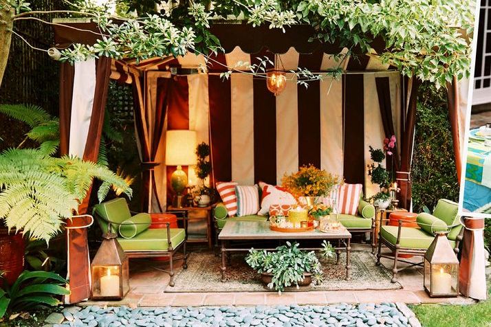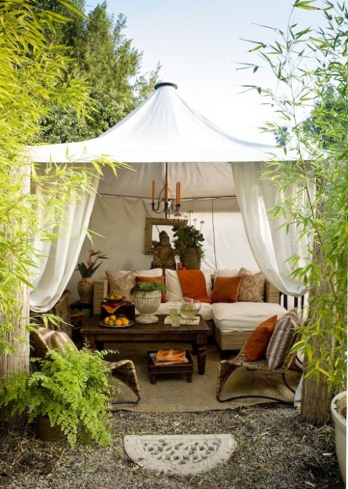 - الأثاث والديكور. طاولة منخفضة ، وسائد ناعمة ذات شرابات ، مريحة للجلوس أو حتى الاستلقاء إذا أردت. على الأرض يمكنك وضع سجادة. ضع المصابيح المعدنية مع الشموع في الزوايا ، وتمثالًا رائعًا على الطاولة.
