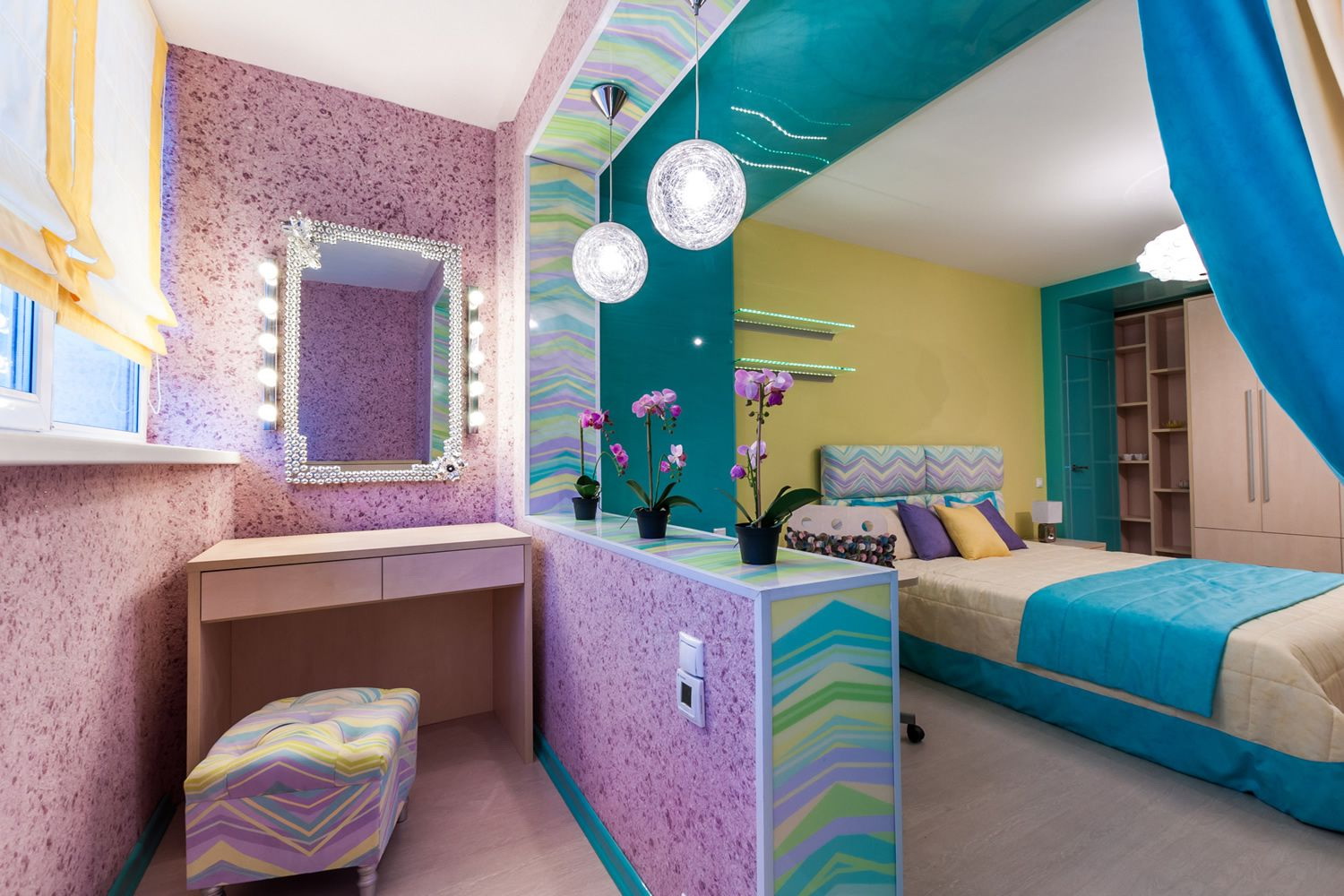 بالإضافة إلى هذه التأثيرات ، يمكن أن يعمل السائل كأداة لتقسيم الغرفة. سيكون هذا الاستقبال جيدًا ليس فقط لغرفة النوم ، ولكن أيضًا لغرفة المعيشة وللحضانة.