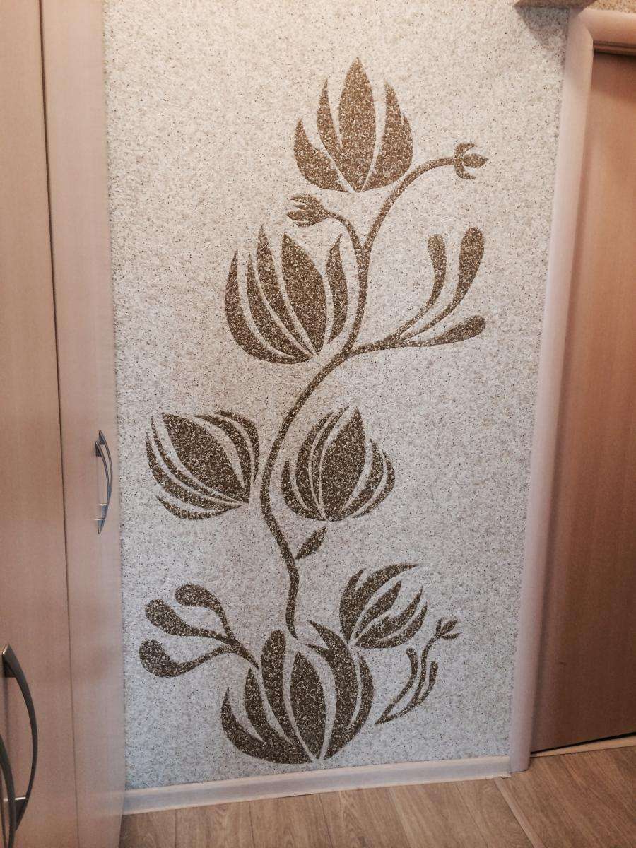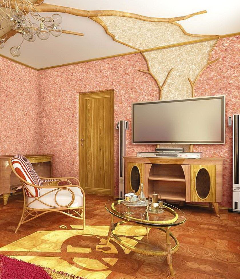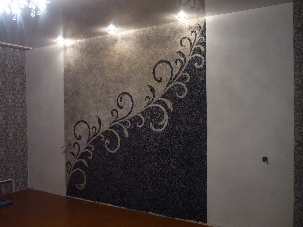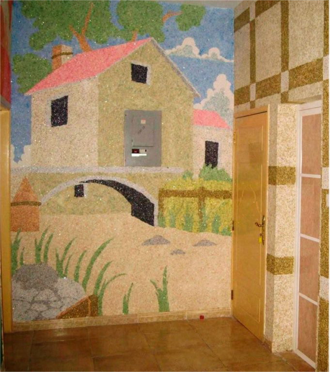 لتنشيط المناطق الداخلية ، يمكنك إضافة خطوط أو أنماط أكثر تعقيدًا. في تجسيد لخيالك ، يمكنك بسهولة الجمع بين ألوان مختلفة من ورق الحائط السائل مع بعضها البعض ، أو دمجها مع مواد تشطيب أخرى أو استخدامها فقط لإنشاء رسومات.