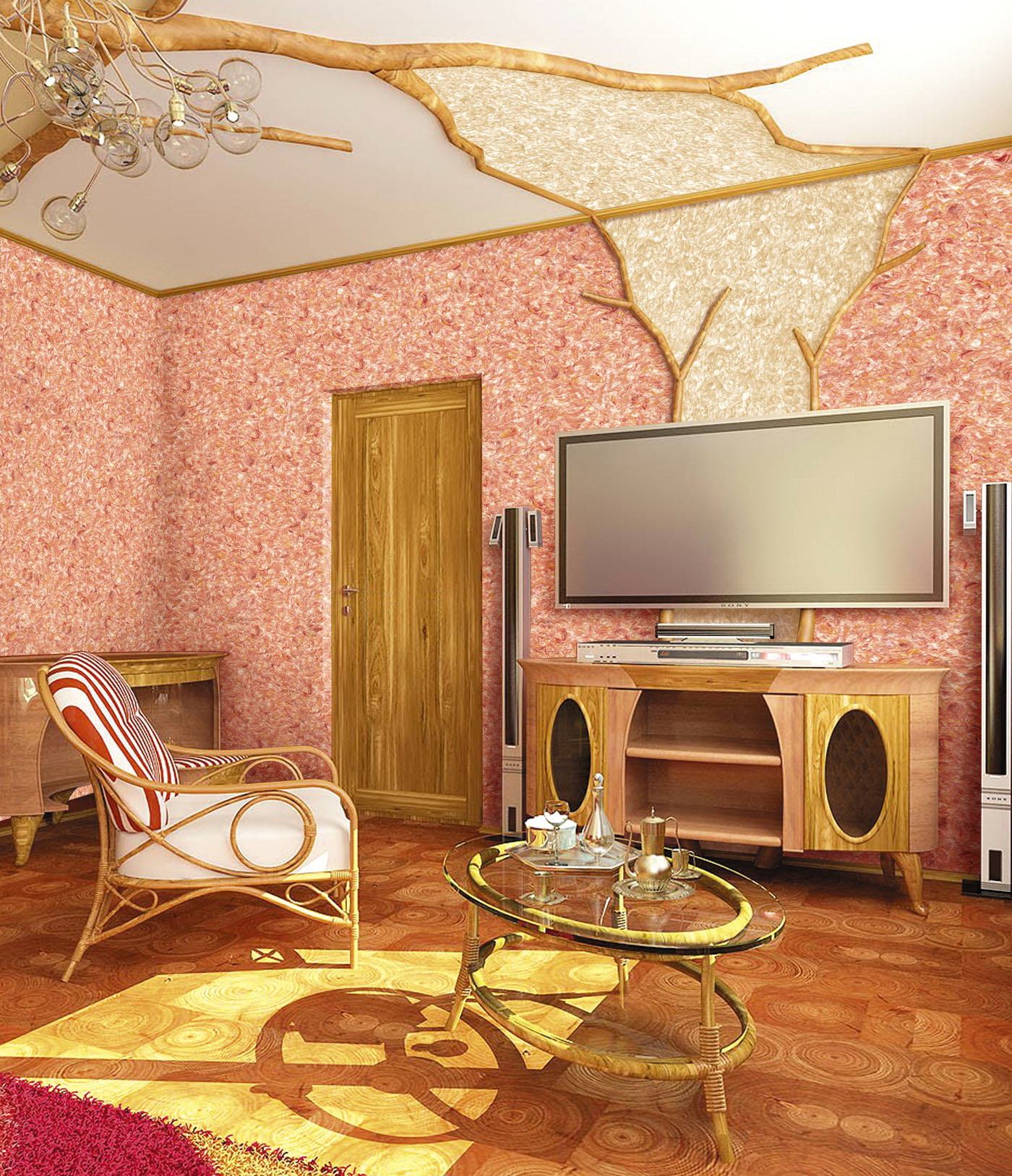 يتيح لك التصميم الزخرفي وورق الحائط السائل إنشاء رسومات مثيرة للاهتمام وتجسيد أفكار التصميم. ولا حتى السطح المثالي سيحصل على حياة جديدة تمامًا. الملمس الأصلي حريري يخلق تأثيرات غير عادية على السقف. هذا الطلاء سوف تبدو غير تقليدية ومكلفة وأصلية.
