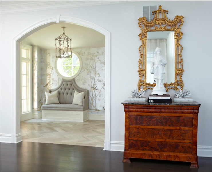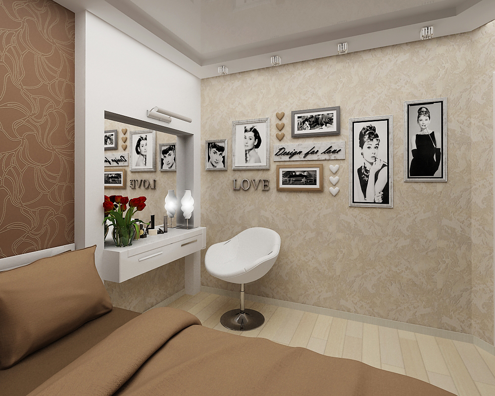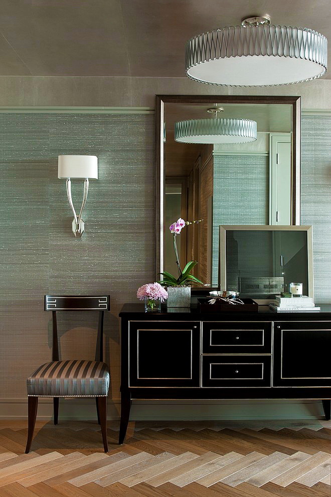 بالنسبة لهذه الغرفة ، ستتيح لك الظلال الهادئة التي تتخللها الفضة والذهب التأكيد على جزء من الجدار ، على سبيل المثال ، اللوح الأمامي. هذا يخلق لهجة الأصلي في التصميم.