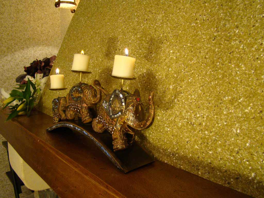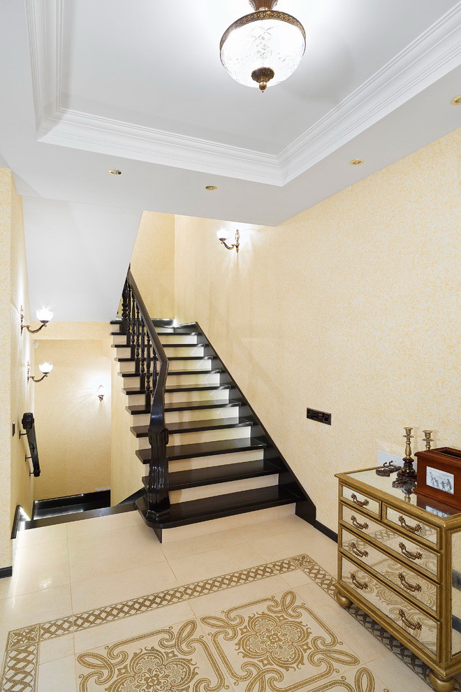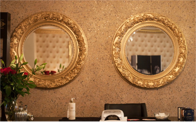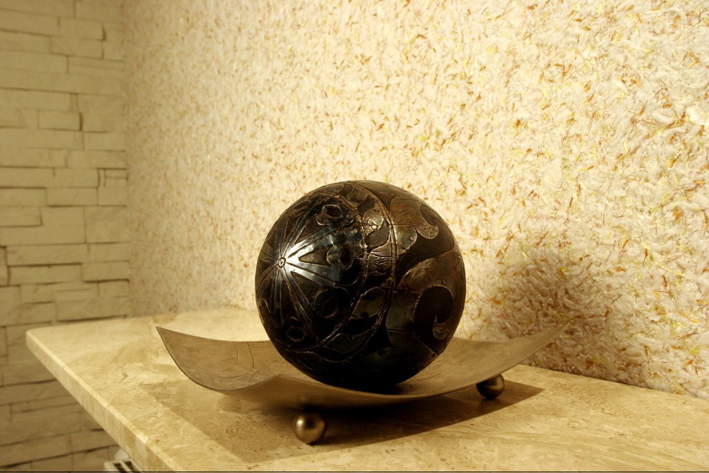 يمكنك إنشاء تصميم داخلي جميل وفخم باستخدام هذا النوع من النهاية. للقيام بذلك ، حدد الظلال الدافئة من الألوان الكلاسيكية مع مكونات ذهبية مذهلة كحشو. تمنح جزيئات الخفقان الدفء والحصرية الداخلية ، خاصةً إذا كان جمالها يتميز بالإضاءة الجيدة.