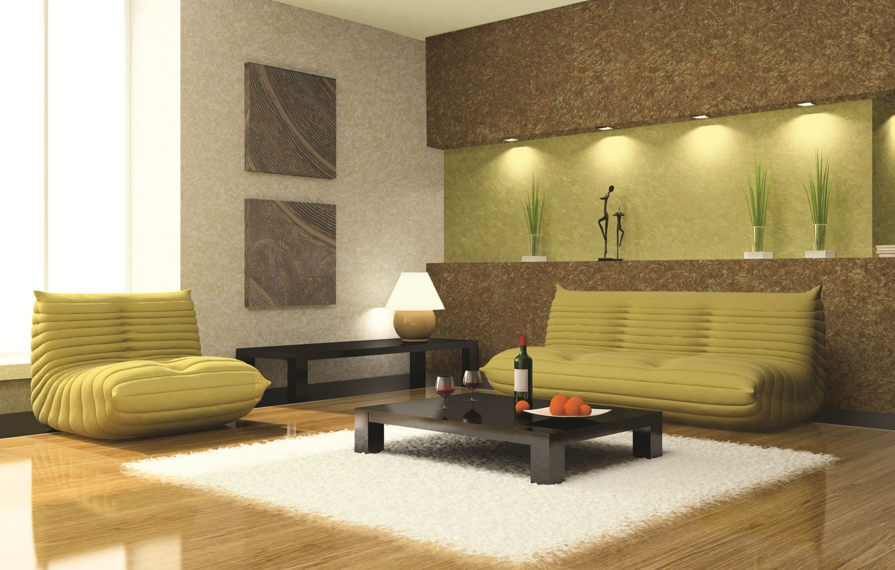 لغرفة المعيشة ، يمكنك اختيار ليس فقط الألوان الزاهية ، ولكن أيضا كتم الصوت. يمكن دمج ورق الحائط السائل هنا مع مواد تشطيب أخرى. يسمح لك هذا الزخرفة بتزيين الجدار بالكامل أو تحديد جزء فقط في منطقة الاستجمام أو استخدامه لجميع الأسطح.