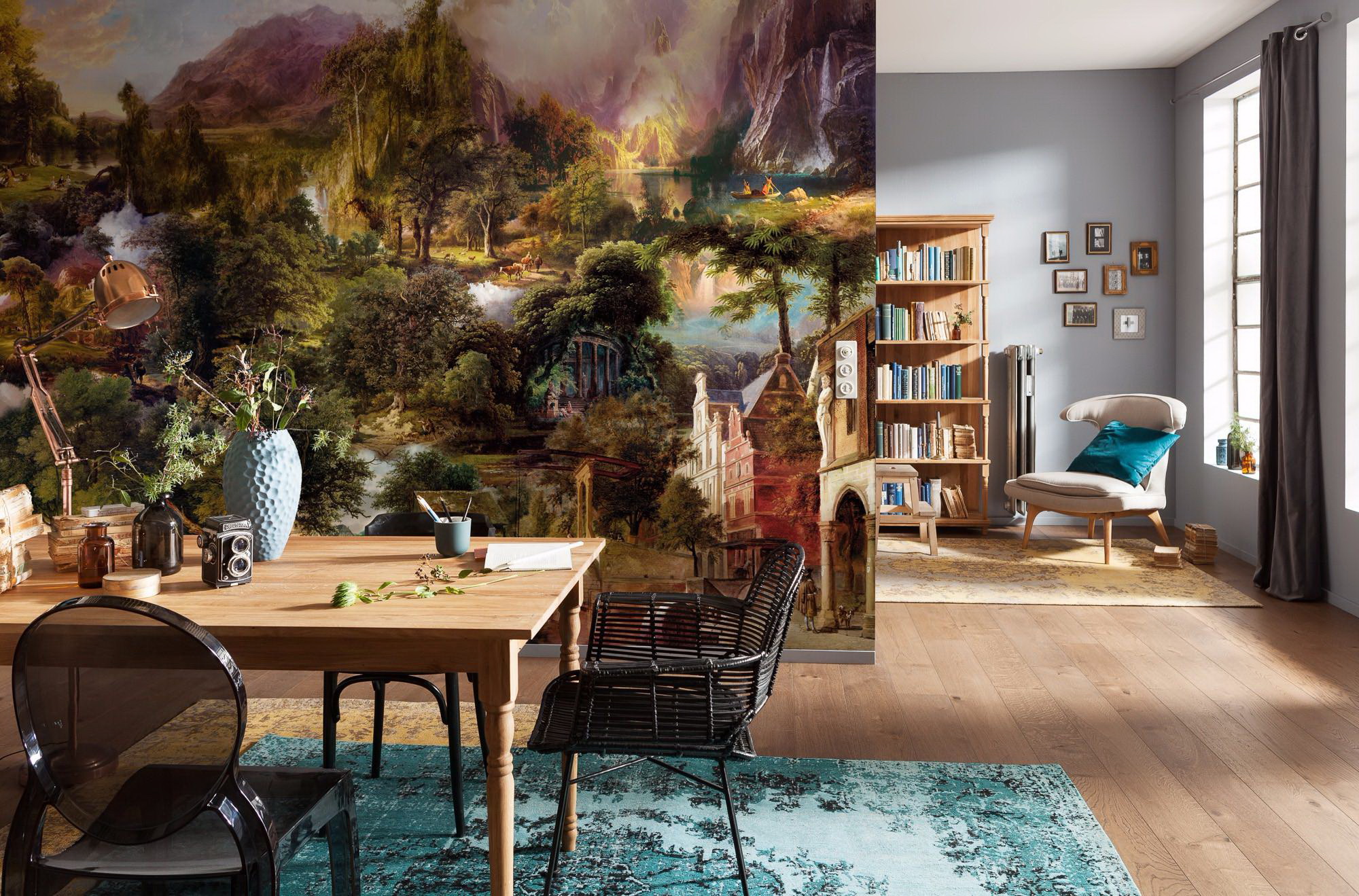Τα "δροσερά" τοπία με την εικόνα, για παράδειγμα, ενός ομίχλης ή ενός φθινοπωρινού πάρκου σε βροχερό καιρό, μπορούν να ισορροπήσουν το ηλιόλουστο δωμάτιο που βλέπει προς το νότο.
