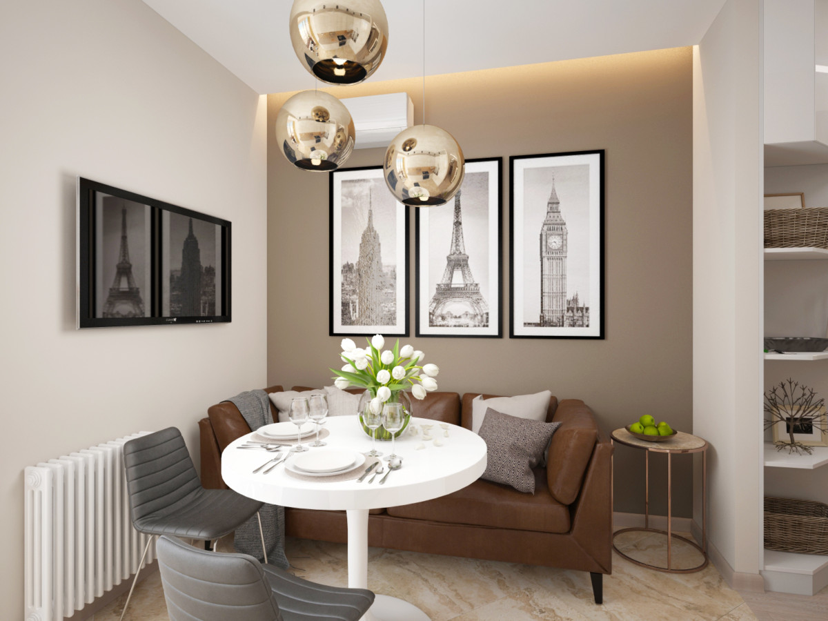 Εάν η πόρτα ανοίξει μέσα στο δωμάτιο, είναι καλύτερα να την αφαιρέσετε εντελώς. Κατά την παραγγελία ντουλαπιών τοίχου, πάρτε το μέγιστο ύψος από την οροφή. Μπορείτε επίσης να χρησιμοποιήσετε την περιοχή πάνω από το παράθυρο. Χρησιμοποιήστε όλες τις μεθόδους για να εξοικονομήσετε χώρο, τότε σίγουρα θα υπάρχει χώρος για την τραπεζαρία.