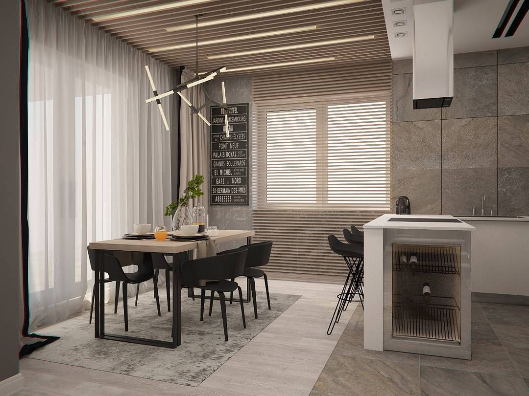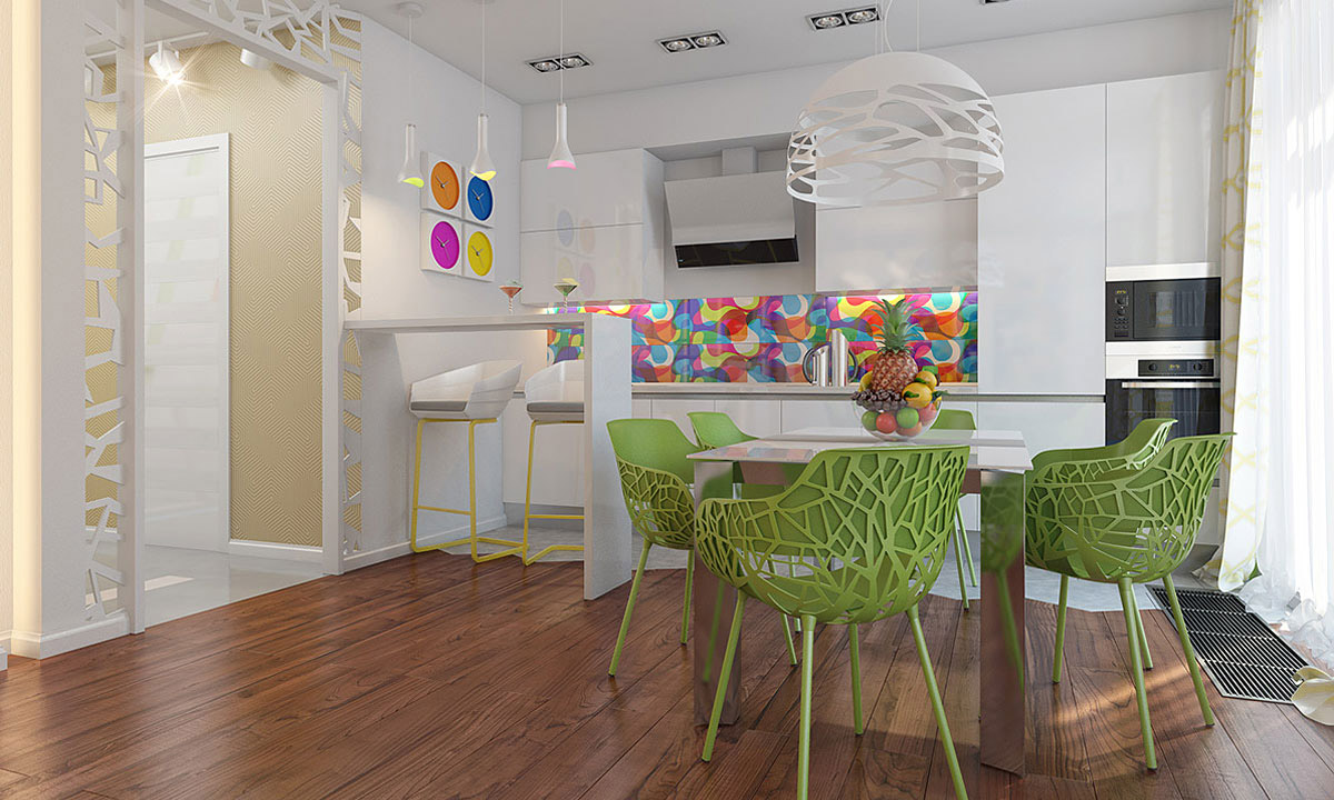 Έτσι, ορίζονται οι χώροι εργασίας και τραπεζαρίας. Τώρα πρέπει να διαχωριστούν οπτικά. Για αυτό, οι σχεδιαστές στο απόθεμα έχουν μερικά μεγάλα κόλπα.