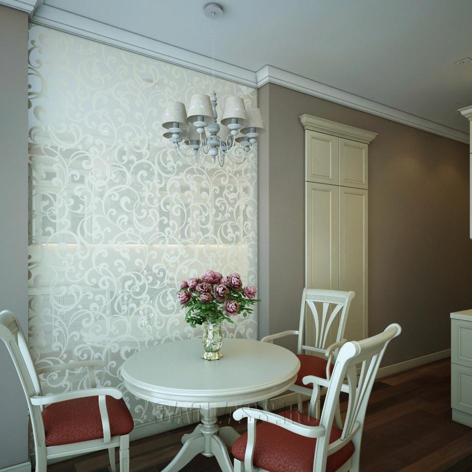 Ταπετσαρίες - Η πιο κοινή επιλογή για το φινίρισμα της τραπεζαρίας. Μπορείτε να συνδυάσετε την απενεργοποιημένη μονόχρωμη ταπετσαρία με ένα φωτεινότερο διακοσμημένο ένθετο στην περιοχή του τραπεζιού. Συχνά, για τη διάκριση της ταπετσαρίας σε συνδυασμό με το βαμμένο για να ταιριάζει με τους τοίχους.