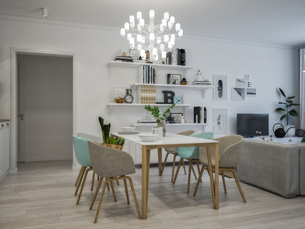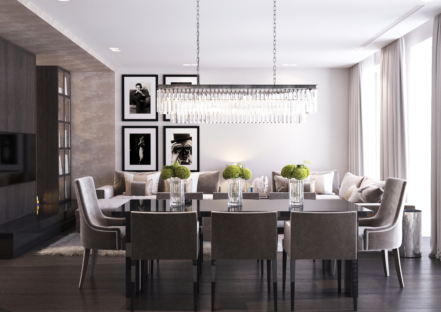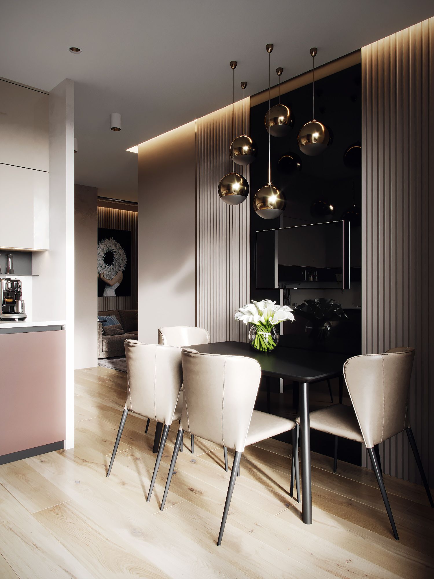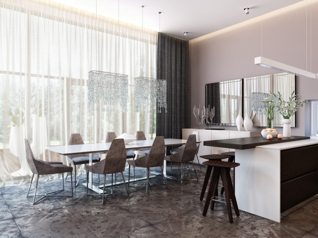 - Η τραπεζαρία φωτίζεται ξεχωριστά. Ένα ζευγάρι λακωνικών λαμπτήρων οροφής ή ένας μεγάλος πολυέλαιος πάνω από το τραπέζι θα λειτουργήσει καλά.