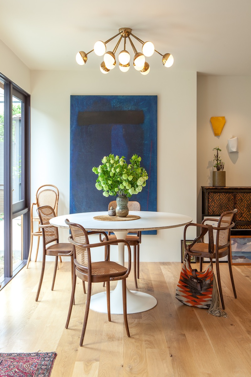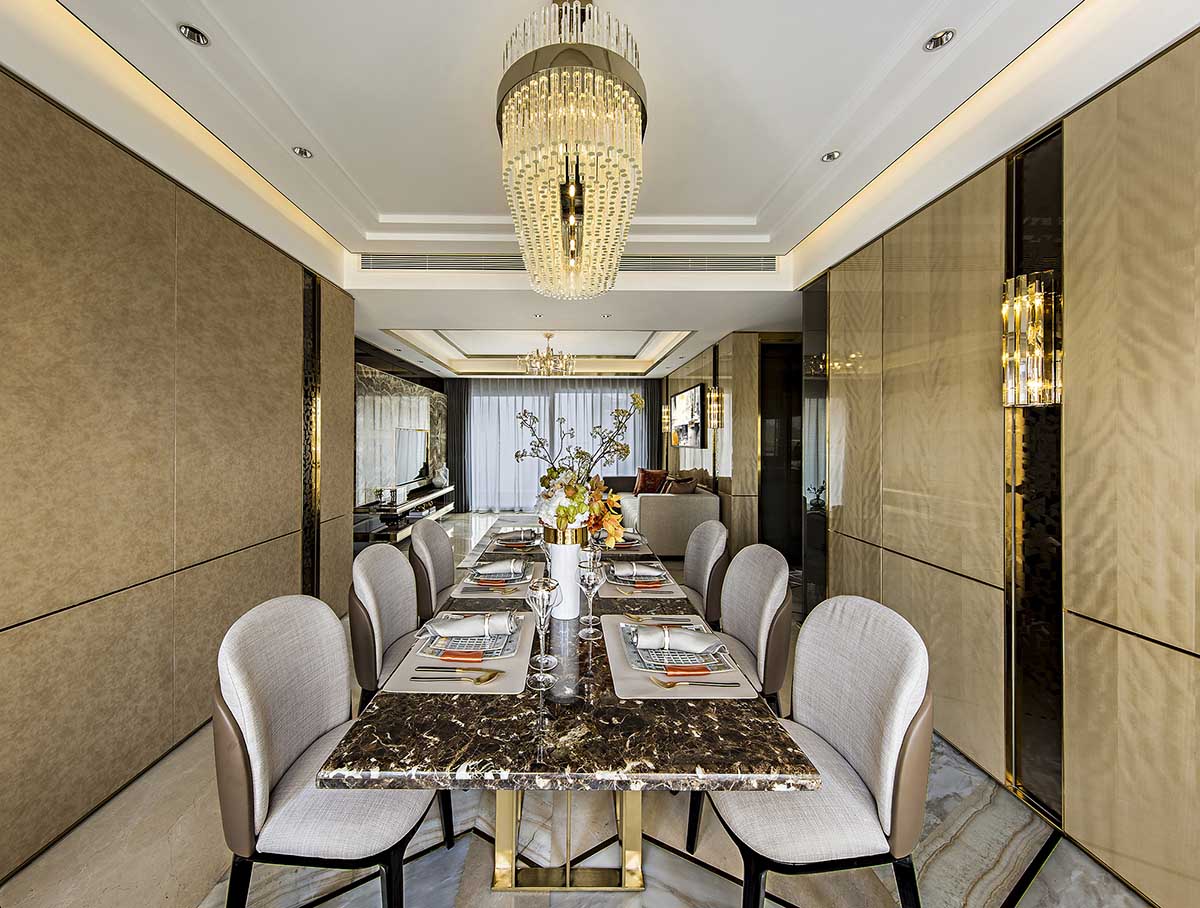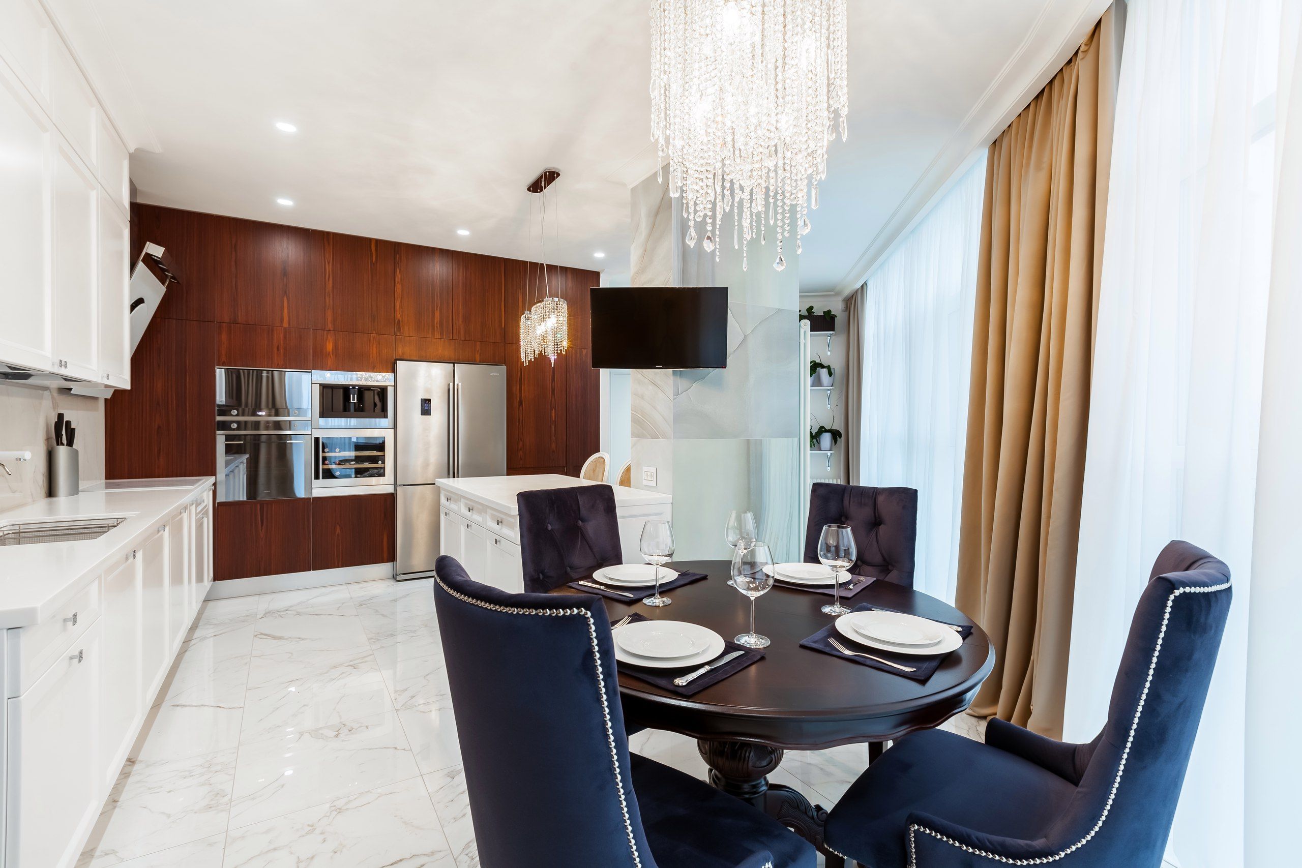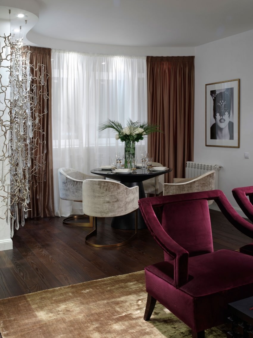 - Η τραπεζαρία φωτίζεται ξεχωριστά. Ένα ζευγάρι λακωνικών λαμπτήρων οροφής ή ένας μεγάλος πολυέλαιος πάνω από το τραπέζι θα λειτουργήσει καλά.