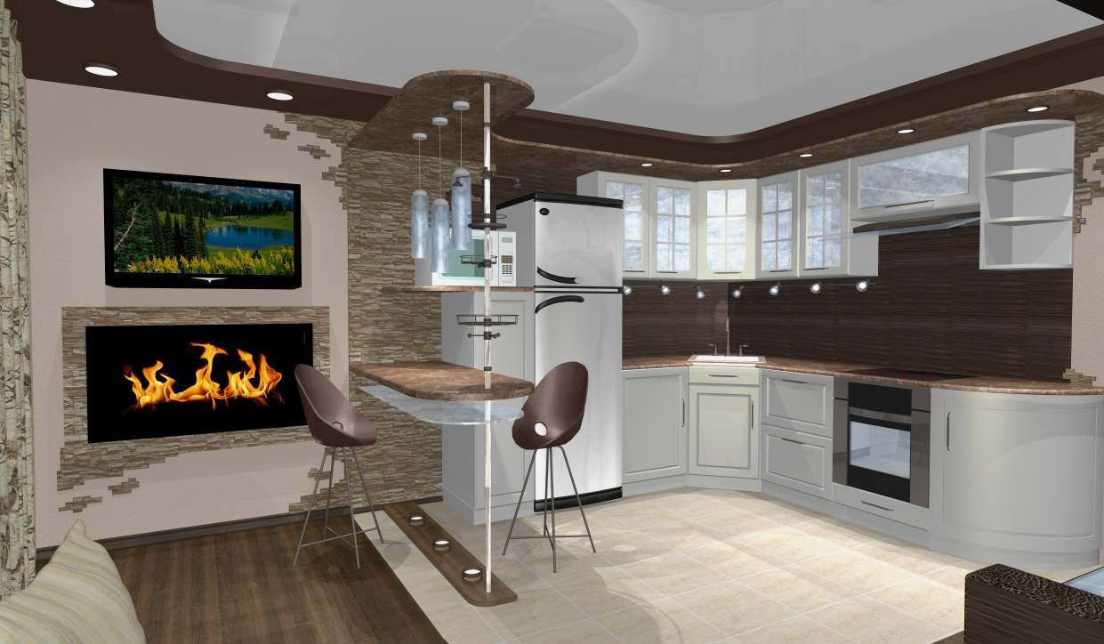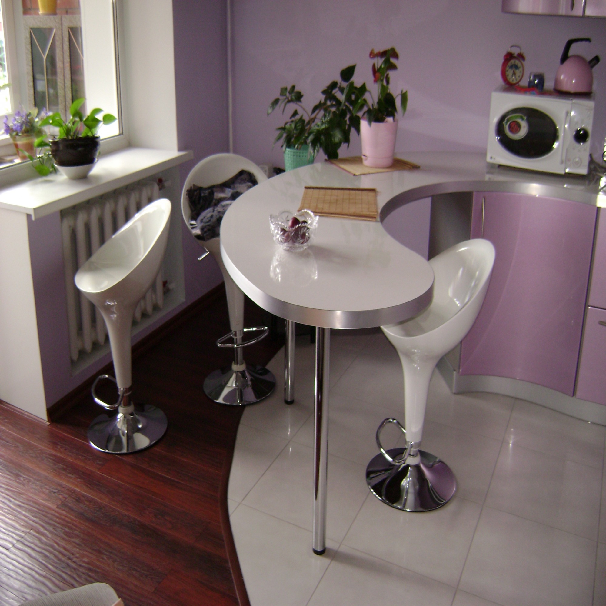 - Το μπαρ στη μικρή κουζίνα αντιμετωπίζει με επιτυχία το ρόλο του τραπεζιού. Και στις κοίλες κόγχες κάτω από το τραπέζι μπορείτε να τοποθετήσετε ένα μίνιτο ψυγείο ή κρυφή ντουλάπα.