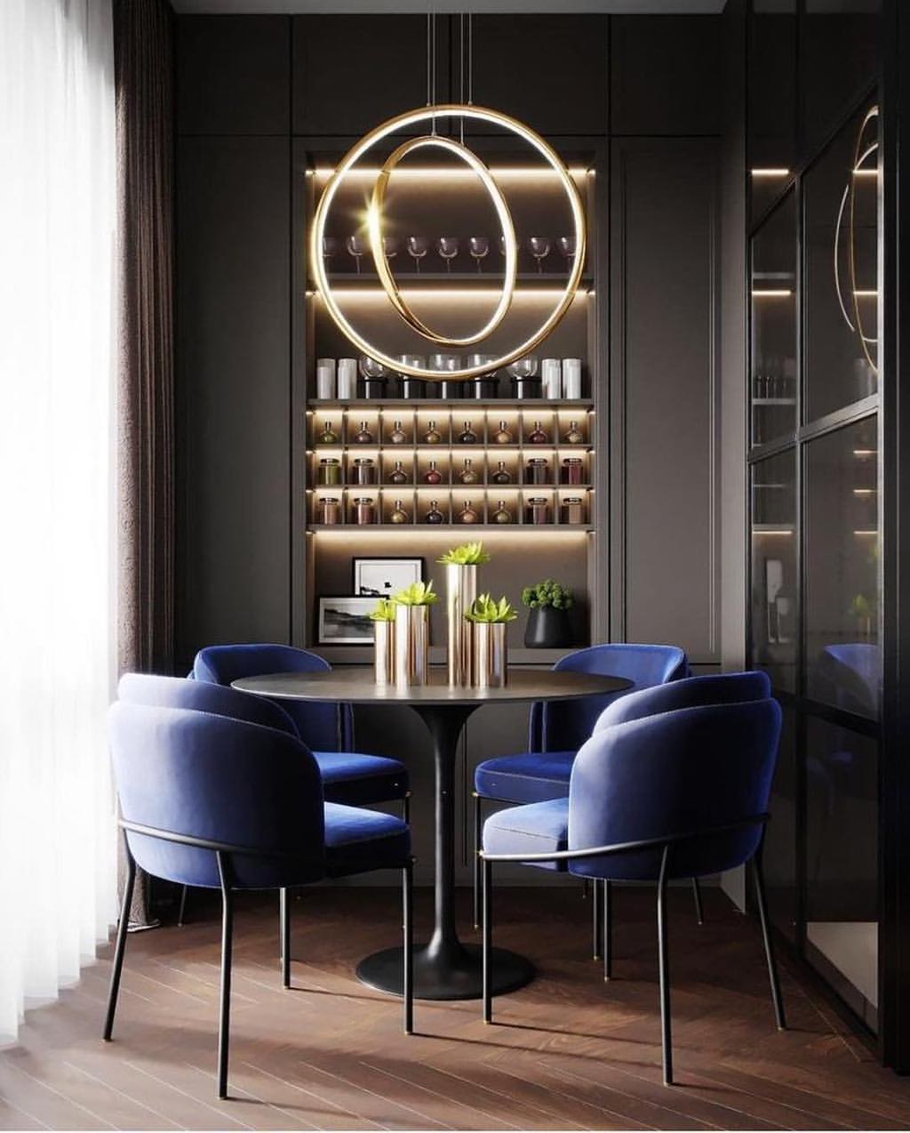 Ένας κομψός μετρητής μπαρ δεν θα δημιουργήσει μόνο τα απαραίτητα σύνορα, αλλά θα γίνει επίσης μια φωτεινή προφορά του εσωτερικού. Αρθρωτός ενισχυμένος σωλήνας - ένα βολικό μέρος για την αποθήκευση γυαλιών.