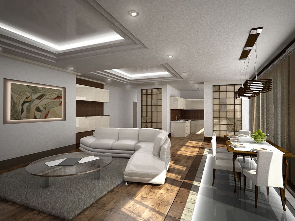 Δύο επίπεδα ανώτατο όριο - ένας όμορφος και πρωτότυπος τρόπος για να χωρίσετε το δωμάτιο οπτικά. Η δεύτερη επιλογή είναι ένα παιχνίδι με υφές και υλικά. Ας υποθέσουμε ότι ένα μέρος μιας οροφής τέντωμα μπορεί να είναι ματ, το άλλο - γυαλιστερό για να ταιριάζει. Όλα εξαρτώνται από το ύφος του εσωτερικού.. Σε ορισμένες περιοχές σχεδιασμού, μπορείτε να δημιουργήσετε έναν αρμονικό συνδυασμό ξύλινων και λευκών οροφών. Η οριοθέτηση οροφής μπορεί να συνδυαστεί με οποιαδήποτε από τις αναφερόμενες μεθόδους ζωνών.
