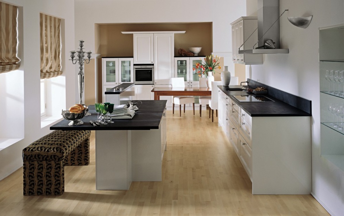 Ένας καλός τρόπος για να διαφοροποιήσετε την κουζίνα - τη χρήση διαφορετικών επενδύσεων δαπέδων. Συνήθως το δάπεδο στο χώρο εργασίας είναι κατασκευασμένο πλακάκια, και στην τραπεζαρία - laminate δάπεδα. Αυτή η λύση είναι πιο πρακτική, καθώς το κεραμίδι είναι εύκολο να καθαριστεί και το έλασμα δημιουργεί μια αίσθηση ζεστασιάς στα πόδια κατά τη διάρκεια του γεύματος. Εάν η κουζίνα σας θερμαίνεται με ζεστά δάπεδα, το laminate δεν θα λειτουργήσει. Μπορείτε να χρησιμοποιήσετε την ίδια τεχνική ζωνών επιλέγοντας δύο χρώματα κεραμιδιών.