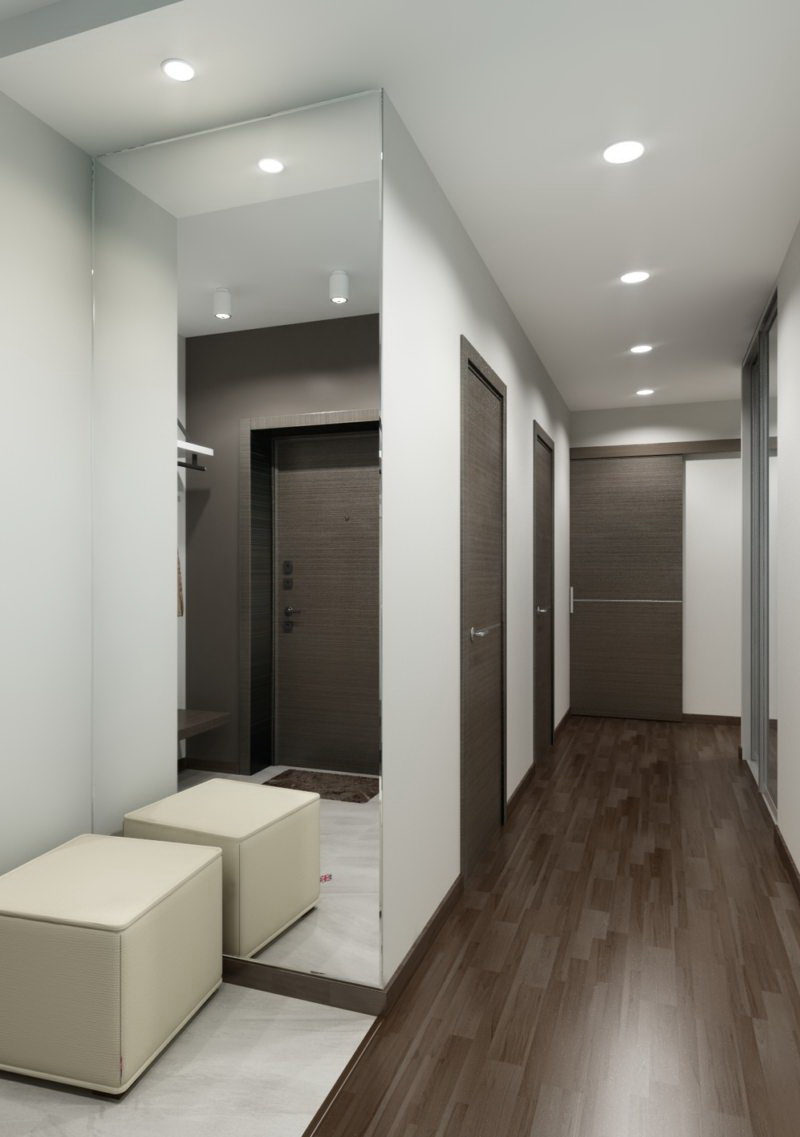 Η λειτουργία του διαδρόμου εξαρτάται από την αποθήκευση ρούχων, παπουτσιών και αξεσουάρ. Σύγχρονη ντουλάπα με ύψος μέχρι την οροφή, εγκατεστημένη σε όλο το μήκος του τοίχου, καλύπτει τέλεια αυτό το έργο.