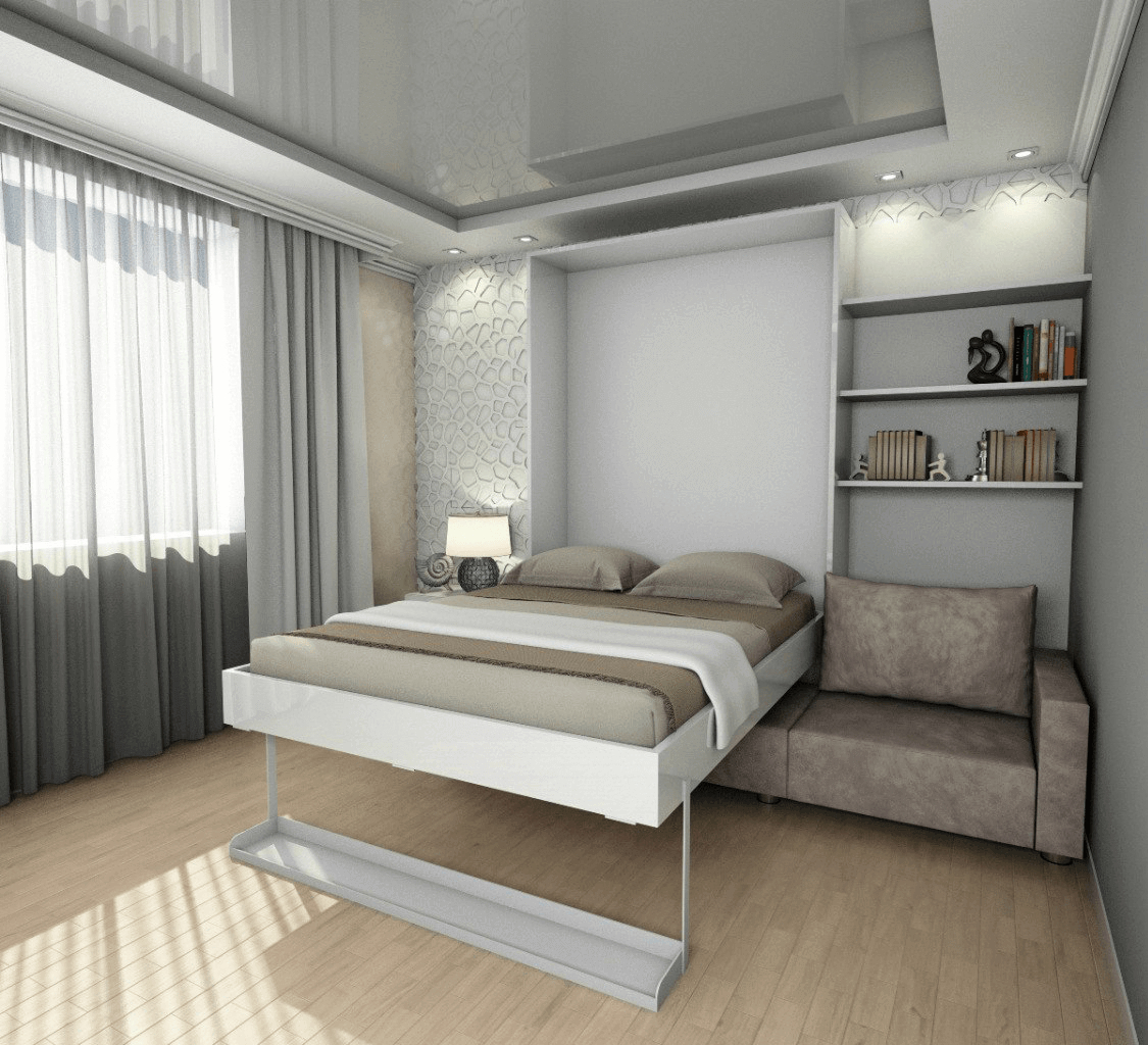 Μια εξαιρετική επιλογή όσον αφορά την εξοικονόμηση χώρου θα ήταν η αναδίπλωση το κρεβάτιημέρα κάθετα προσαρμόζεται στον τοίχο. Θα είναι ένα πλήρες κρεβάτι, για το οποίο δεν μπορούμε να πούμε καναπέμετασχηματιστή.