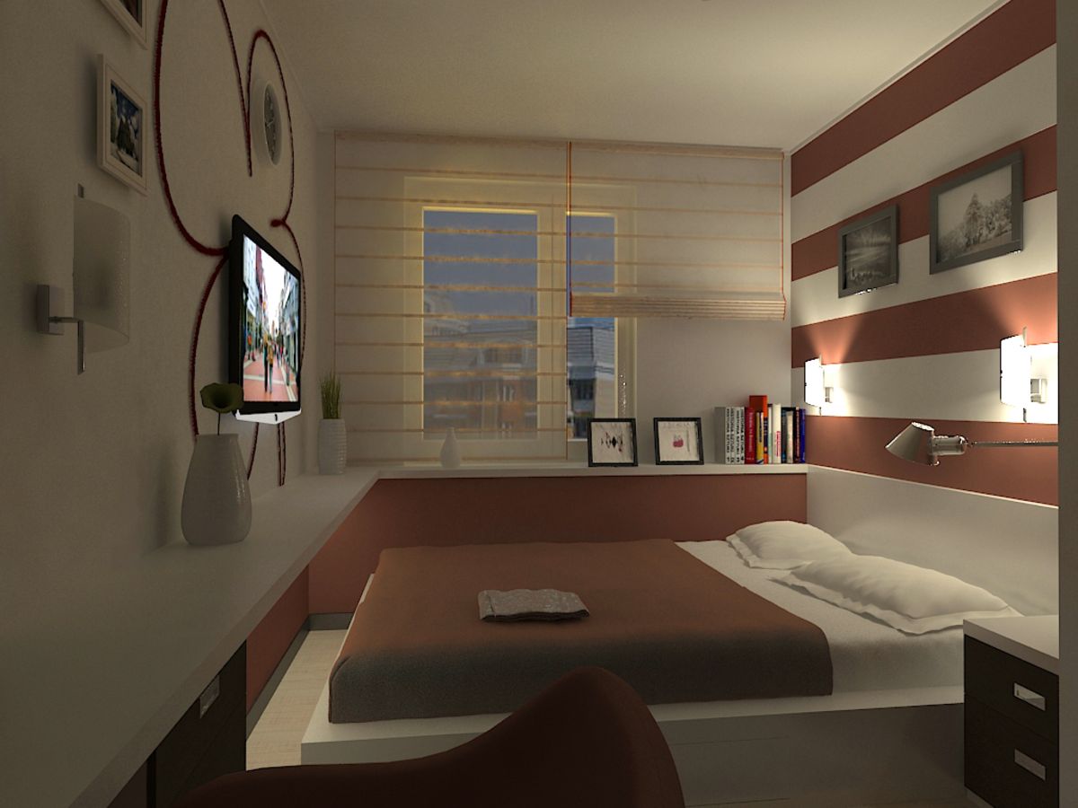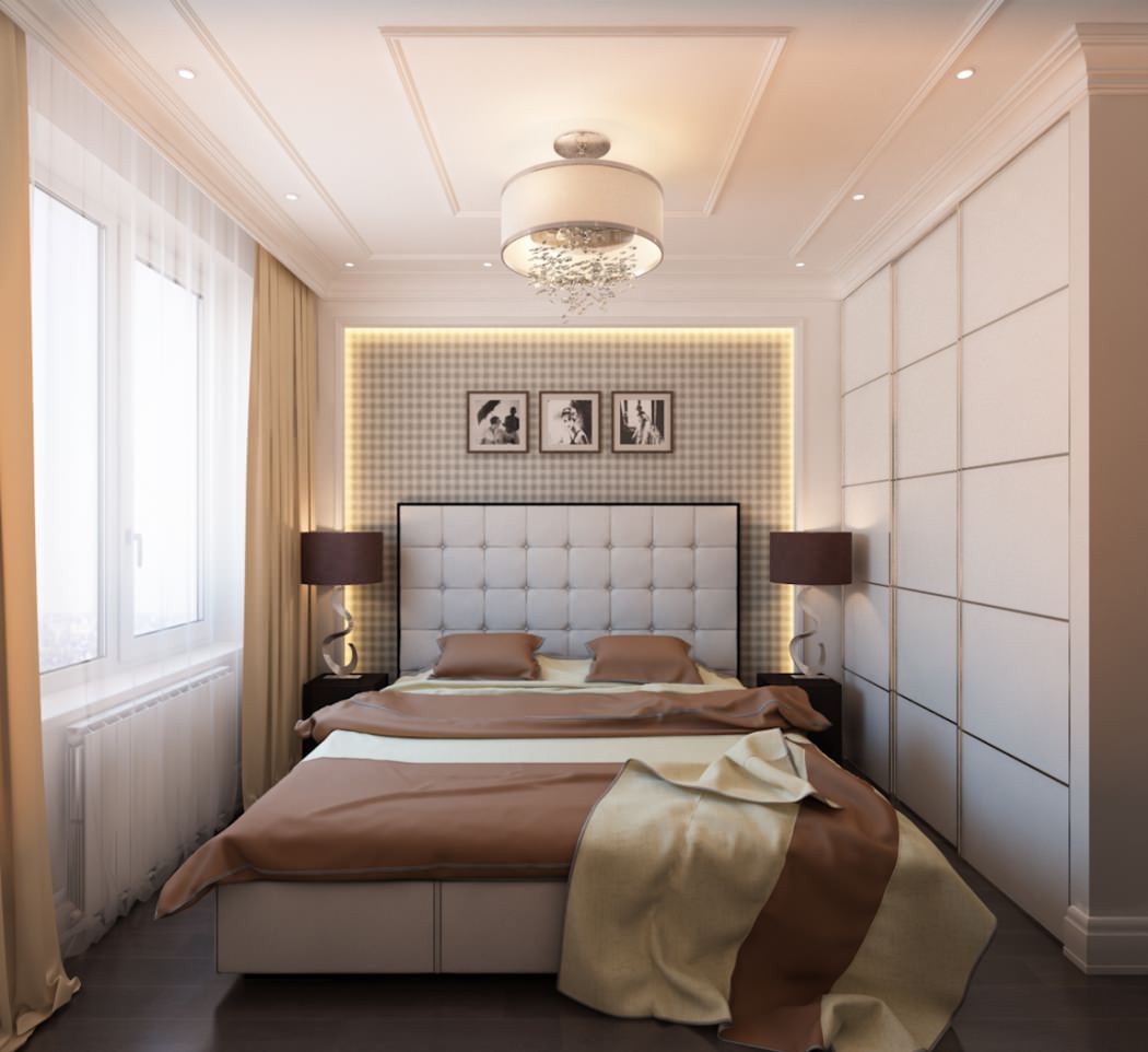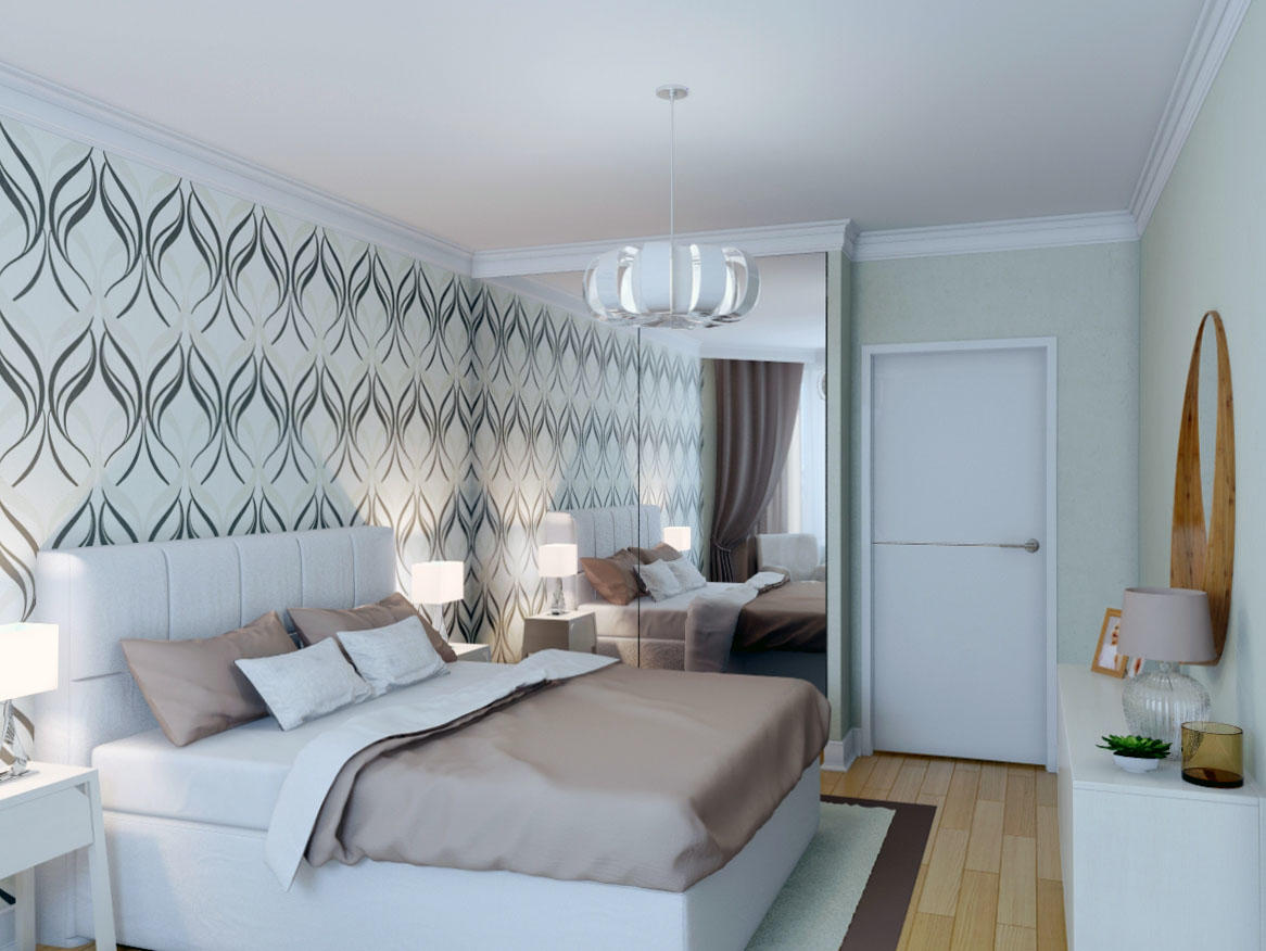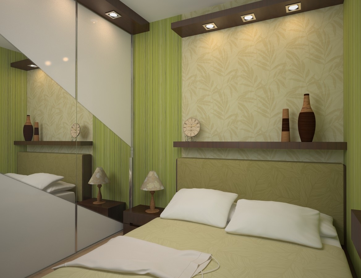 Κάθε υπνοδωμάτιο μπορεί να είναι ένας πραγματικός χώρος ξεκούρασης και χαλάρωσης, ανεξάρτητα από το αρχικό μέγεθος. Τα ανοιχτά χρώματα χρησιμοποιούνται για τη δημιουργία ενός οπτικά ενισχυμένου χώρου στο σχέδιο. Οι επιφάνειες καθρέφτη σε μακρινούς τοίχους κρύβουν οπτικά την επιμήκυνση του δωματίου. Οι οριζόντιες λωρίδες των ανοιχτών χρωμάτων διευρύνουν τον στενό χώρο.