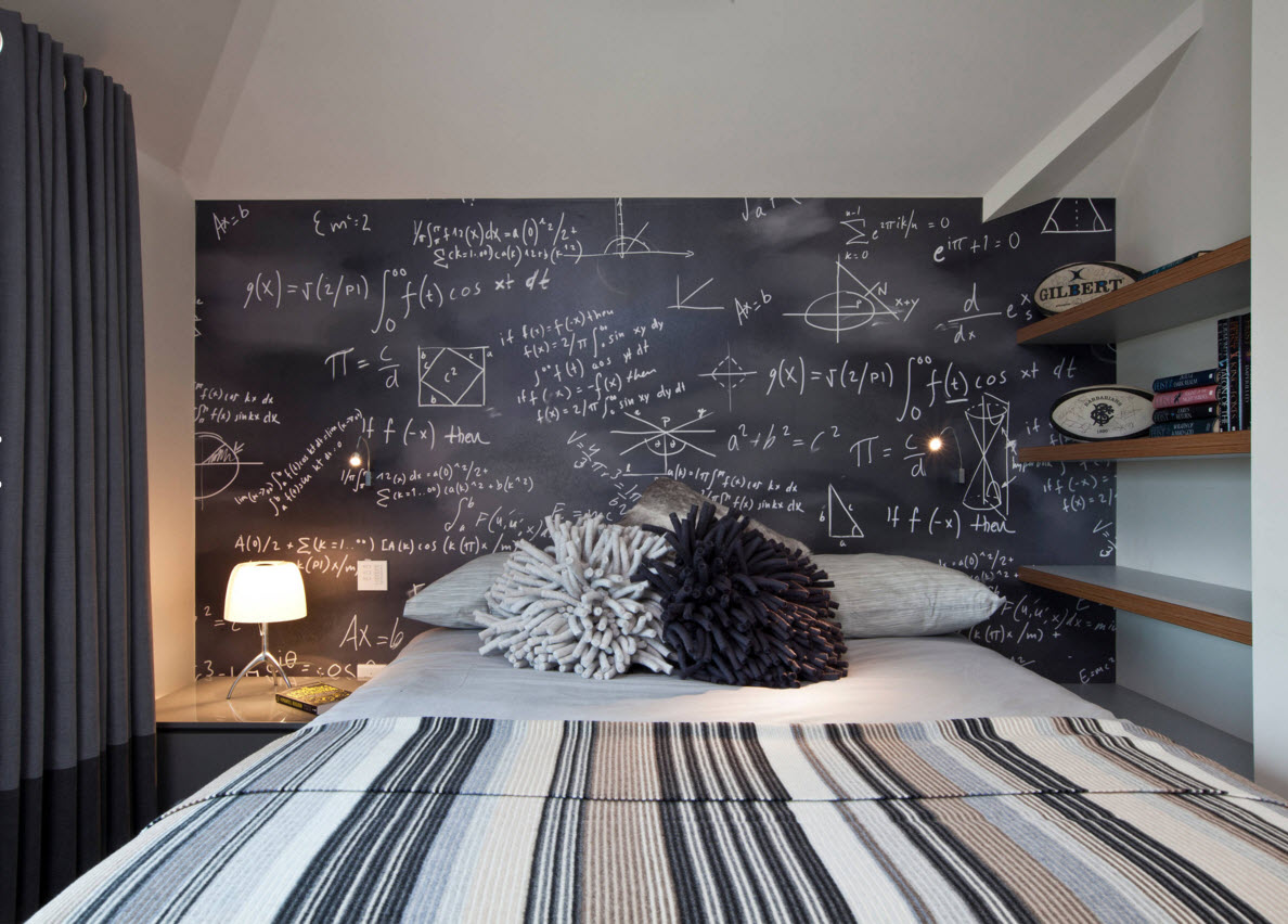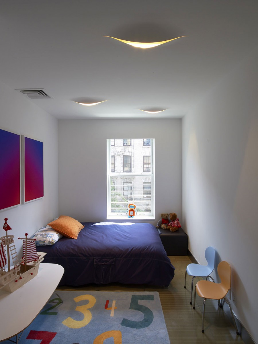 Ο κάθετος χώρος μπορεί να προσφέρει το μέγιστο όφελος εάν ένας μεγάλος τοίχος με ευρύχωρα ντουλάπια και ένα ευρύχωρο ημιώροφο είναι κτισμένο πάνω από το κεφαλάρι. Ο τοίχος τρέχει χωρίς λαβές έτσι ώστε τα ντουλάπια να μην είναι ορατά.