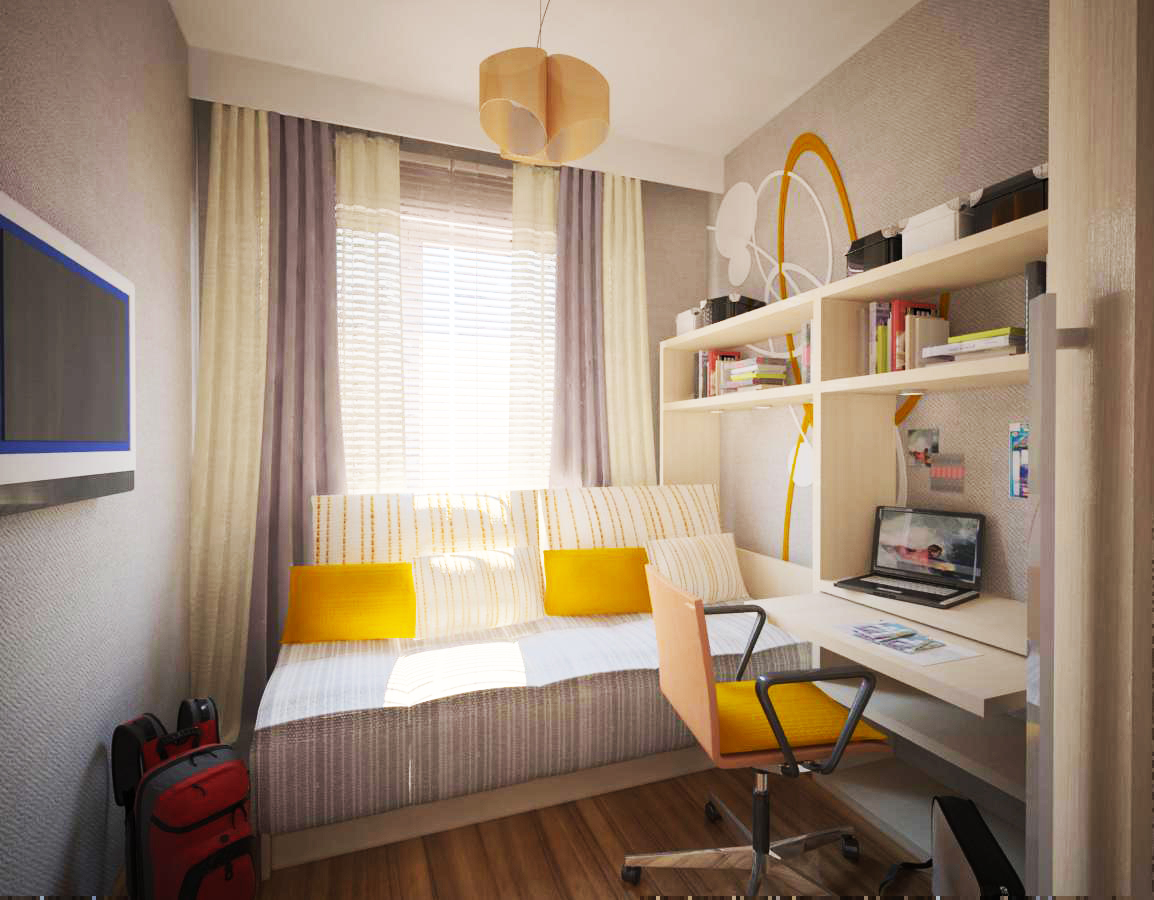 - Μπορείτε επίσης να επιλέξετε άνετα πτυσσόμενα συστήματα ύπνου τοποθετώντας το κατά μήκος του τοίχου και το πρόβλημα της κατοχής του μεγαλύτερου μέρους του δωματίου με έπιπλα επιλύεται.