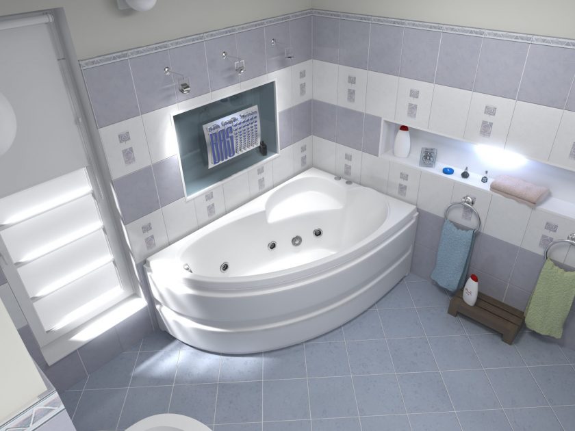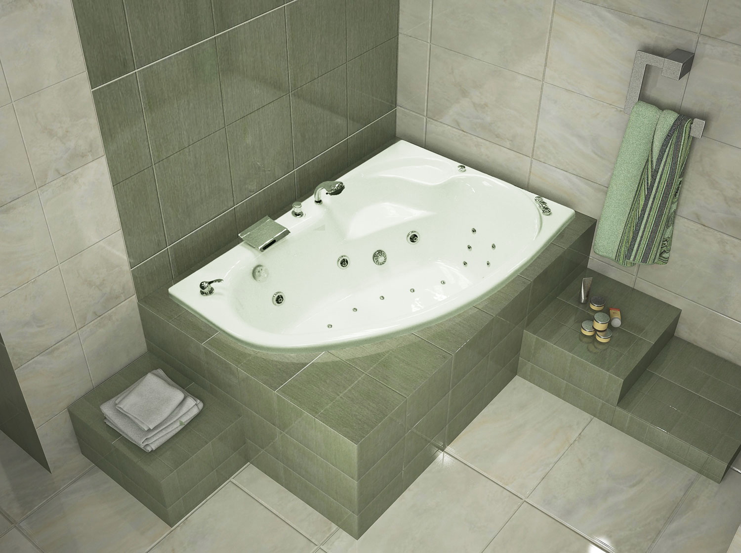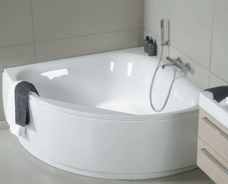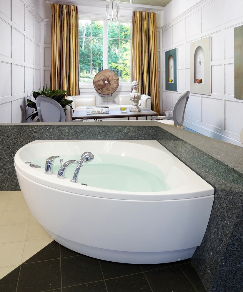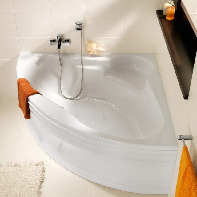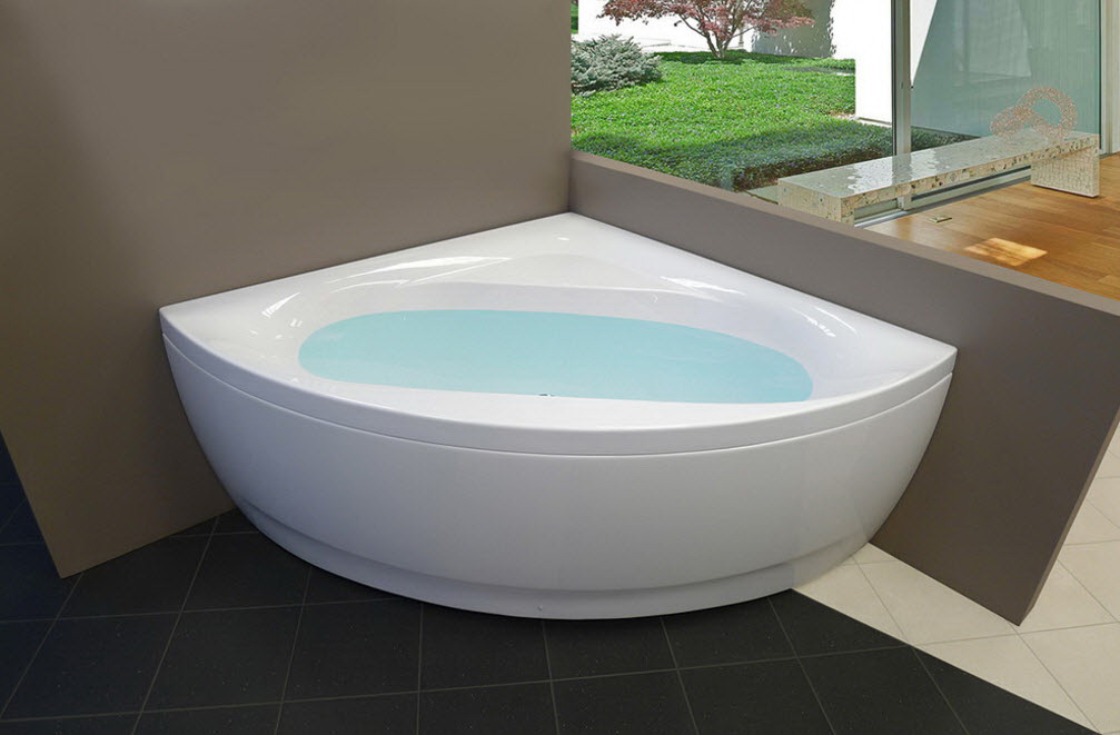 - Esquina. Banho para uma pequena sala, em que, no entanto, realmente quer começar sua mini-piscina. Mais do que o habitual, permite-lhe esticar ao máximo, é um triângulo, e é importante ter em conta se é direito ou esquerdo - depende de qual canto o design se encaixa.