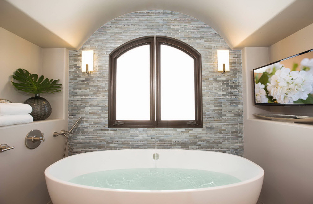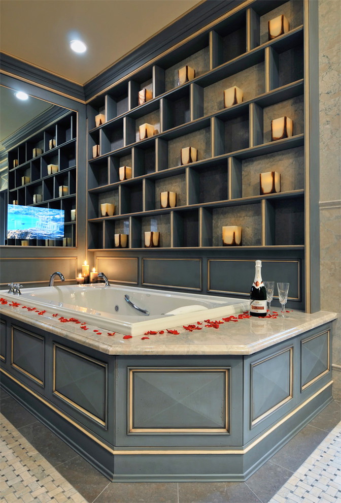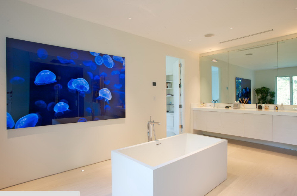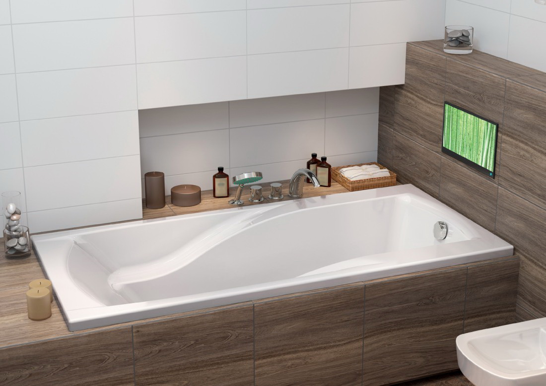 - TV ou jogador. Eles permitem que você assista seus filmes e programas favoritos ou ouça sua música favorita enquanto está deitado na banheira, o que é relaxante. Como regra geral, eles são dispostos de modo que seja confortável de assistir, eles têm um revestimento especial que não se deteriora da água.