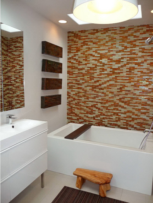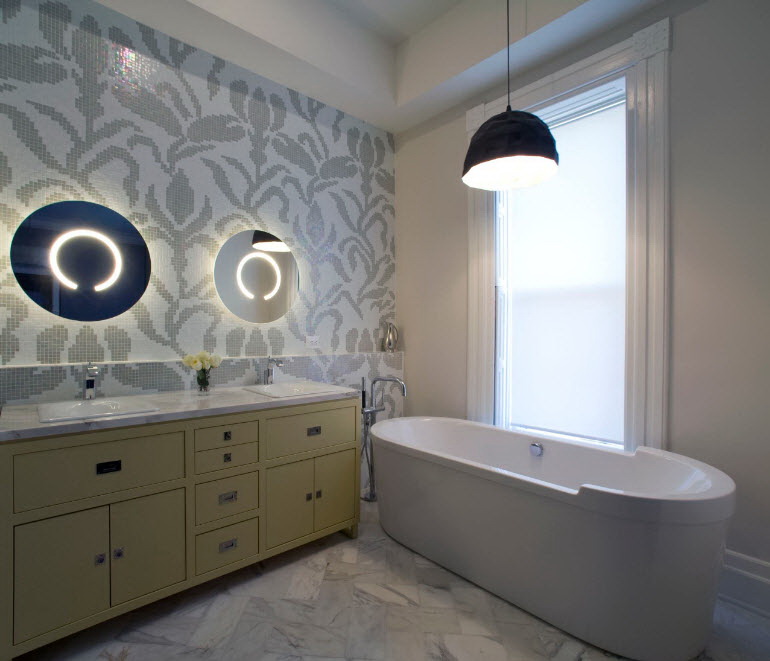 - O espelho. Muito útil para realizar a higiene, geralmente pendurada na pia. Para que sua harmonia com a banheira de acrílico se torne completa, você pode segurar a luz de fundo da mesma cor que fica na luz de fundo do banho - quando eles ligam ao mesmo tempo, haverá um efeito muito agradável.