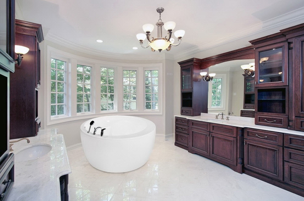 - Rodada. É raro porque requer uma grande quantidade de espaço no banheiro. Parece original e agradável, especialmente se você segurar a luz de fundo, é bom escolher uma cor - como uma tigela luminosa com água fervente. Pode ser uma verdadeira decoração de interiores.