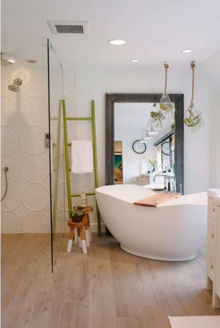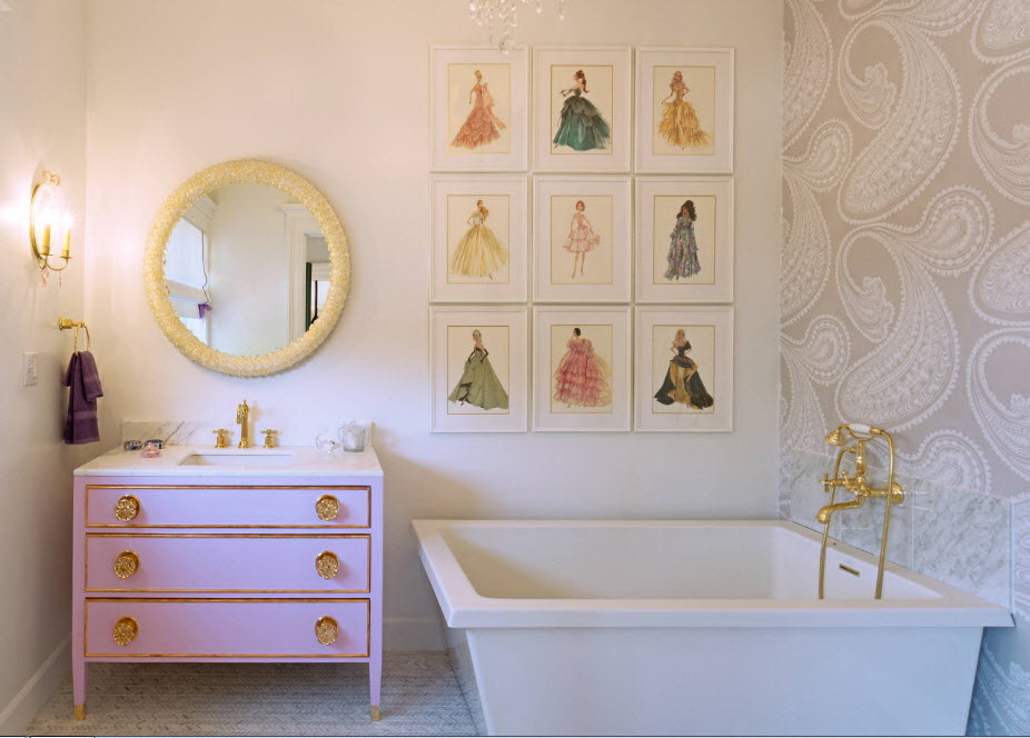- Acessórios de procedimento. Pode ser incorporado no banho ou montado na borda e pode ser colocado ao redor. É bom que eles se aproximem em cores, melhor ainda - se estiver no design. Por exemplo, uma saboneteira redonda e semicircular, um suporte para escovas de dentes, um dispensador para xampu ficará ótimo para um design redondo clássico.