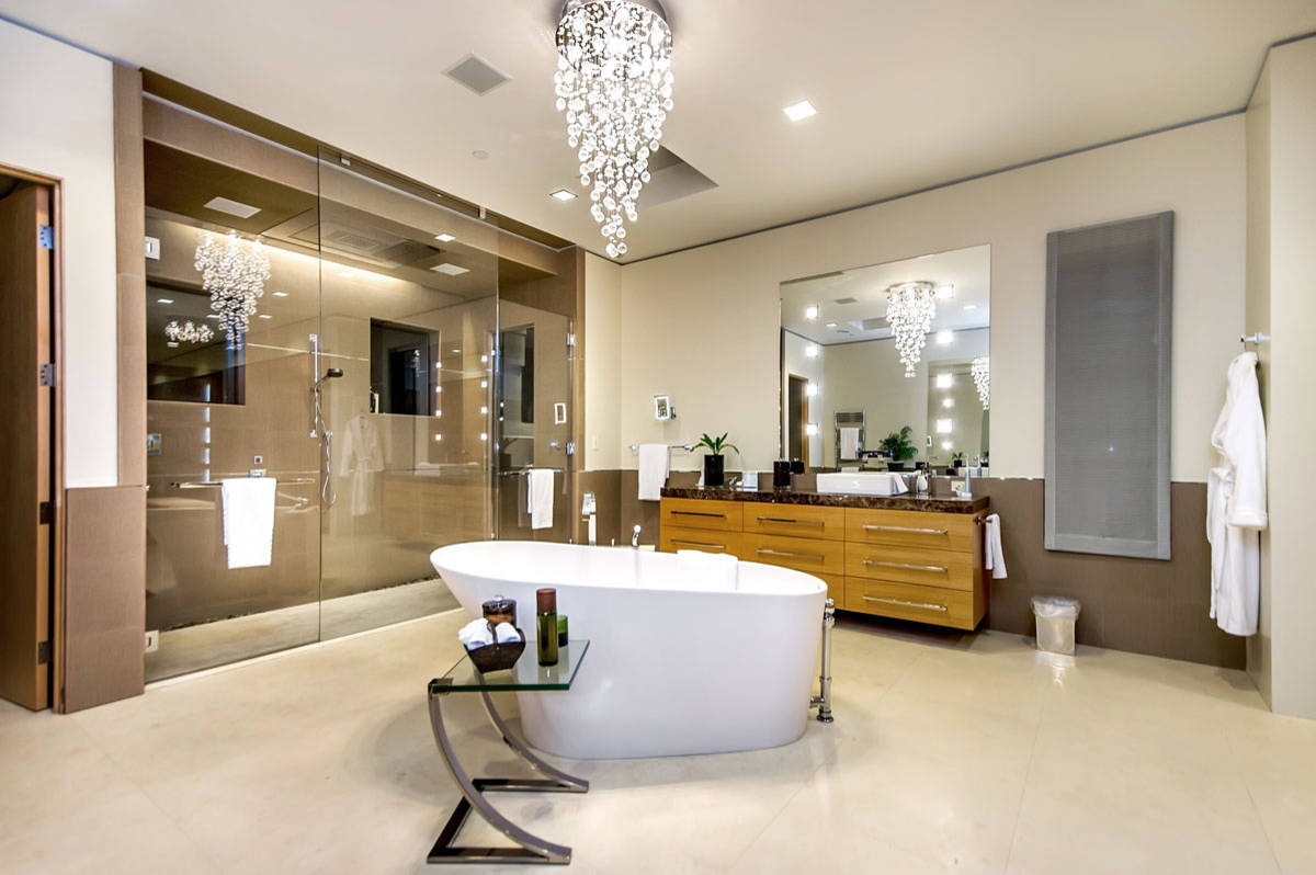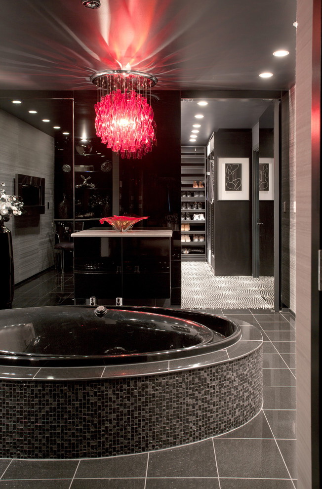 - Cromoterapia. Está provado que uma cor diferente causa diferentes sensações em uma pessoa. O azul se ajusta ao sono, o verde se acalma e ajuda a focar, o vermelho leva ao aumento da ansiedade. Cromoterapia envolve a presença de luzes embutidas no design do banho. Quando uma pessoa vai para a cama após um dia agitado, a luz começa a piscar levemente, acalmando-se, embalando-a. Além disso, a luz de fundo é linda, especialmente quando combinada com elementos transparentes.