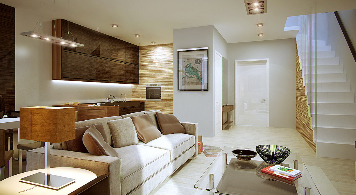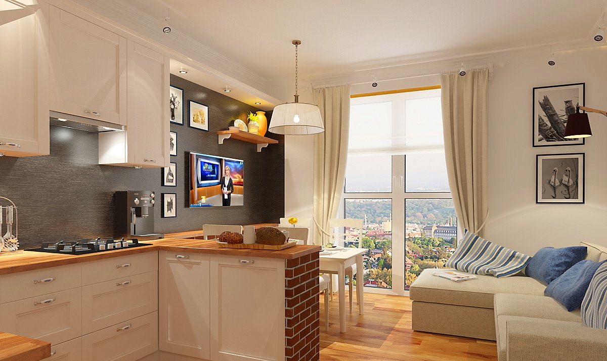 O apartamento de uma pequena praça é muito difícil de organizar lindamente e ao mesmo tempo prático. A fim de evitar lixo com coisas raramente usadas, é aconselhável usar mezaninos.