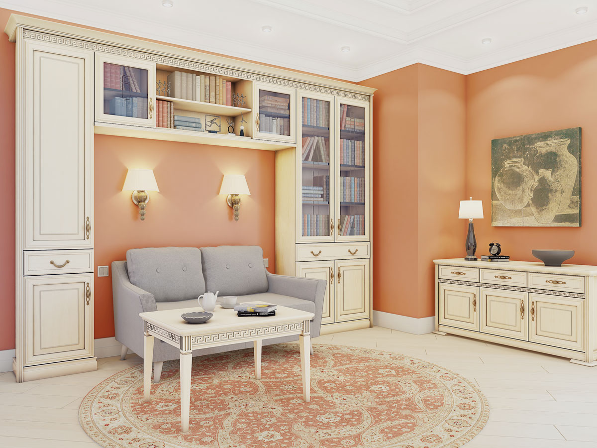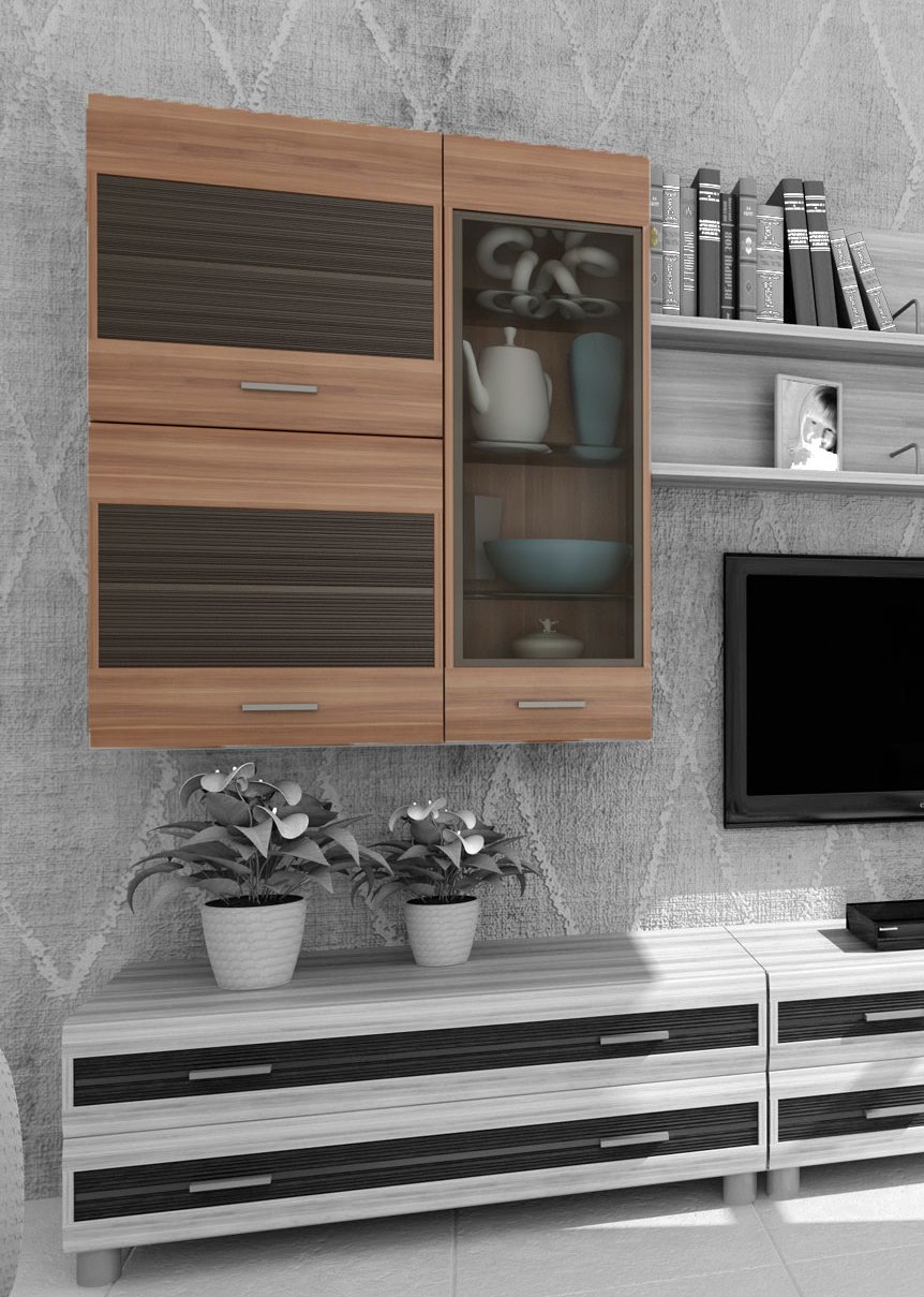 Na sala de estar é especialmente importante que as prateleiras superiores sejam organicamente combinadas com os móveis da sala. A melhor variante da organização é gabinetes altos, complementados por um mezanino perto do teto.
