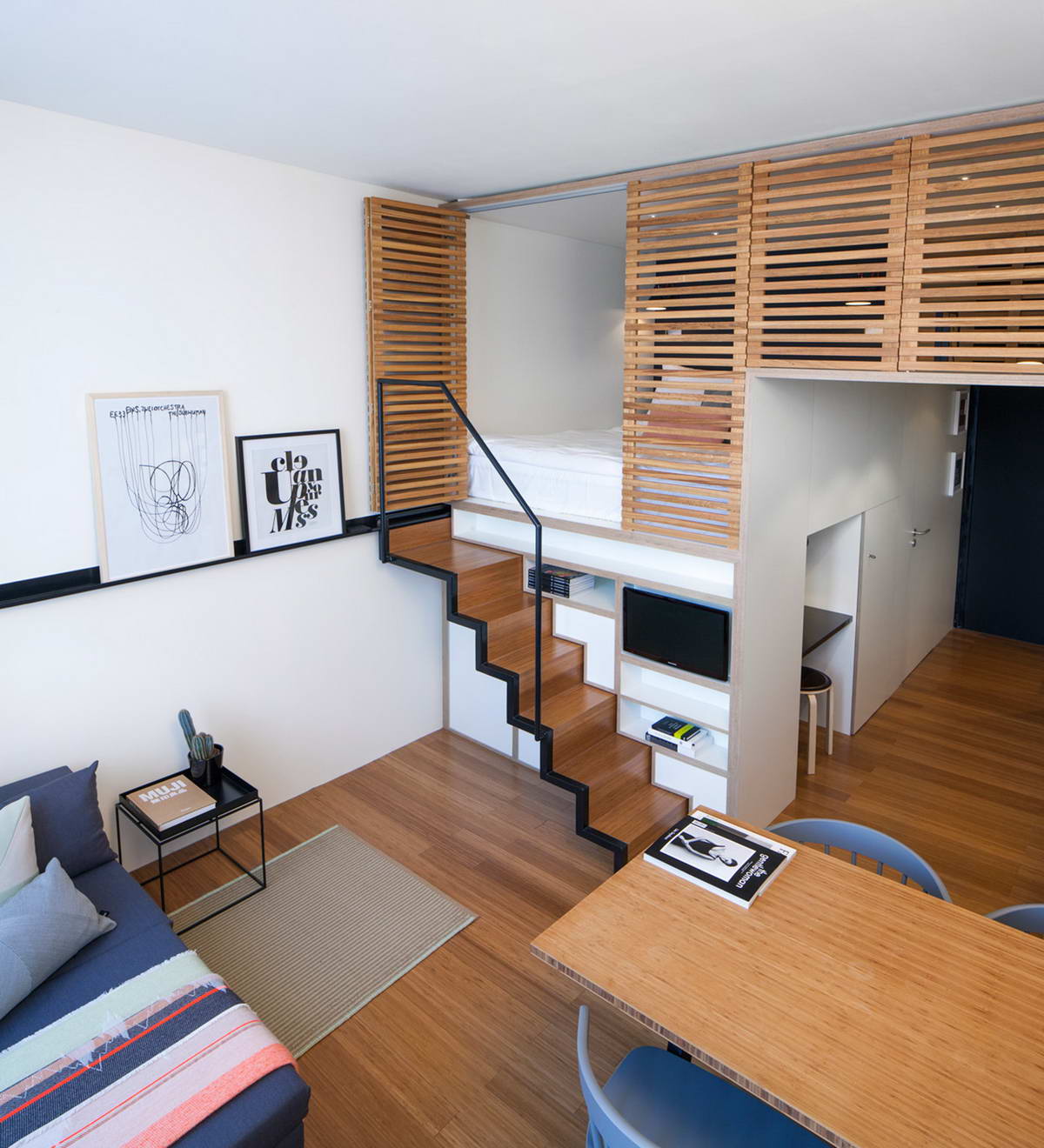 Geralmente mezaninos são fixos entre duas paredes que estão localizadas próximas umas das outras. Na maioria das vezes, esta é a opção escolhida para o corredor, banheiro ou porta para a cozinha.