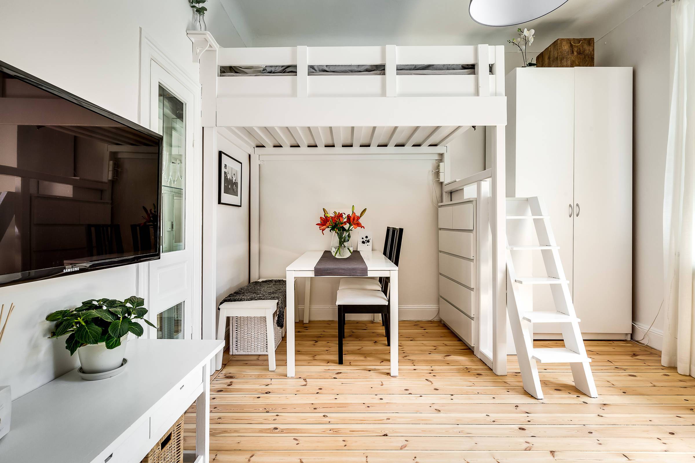 Antresol raramente desempenha o papel do elemento principal. Sistemas de armazenamento compactos e ao mesmo tempo compactos complementam o ambiente existente.