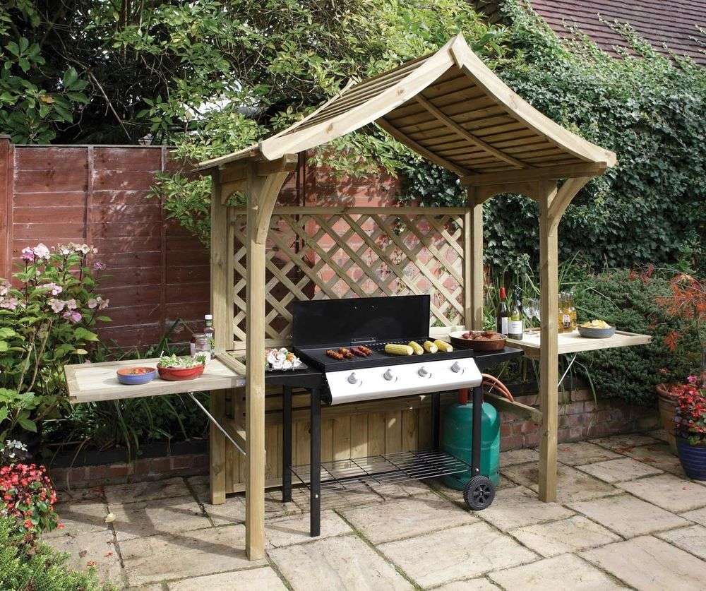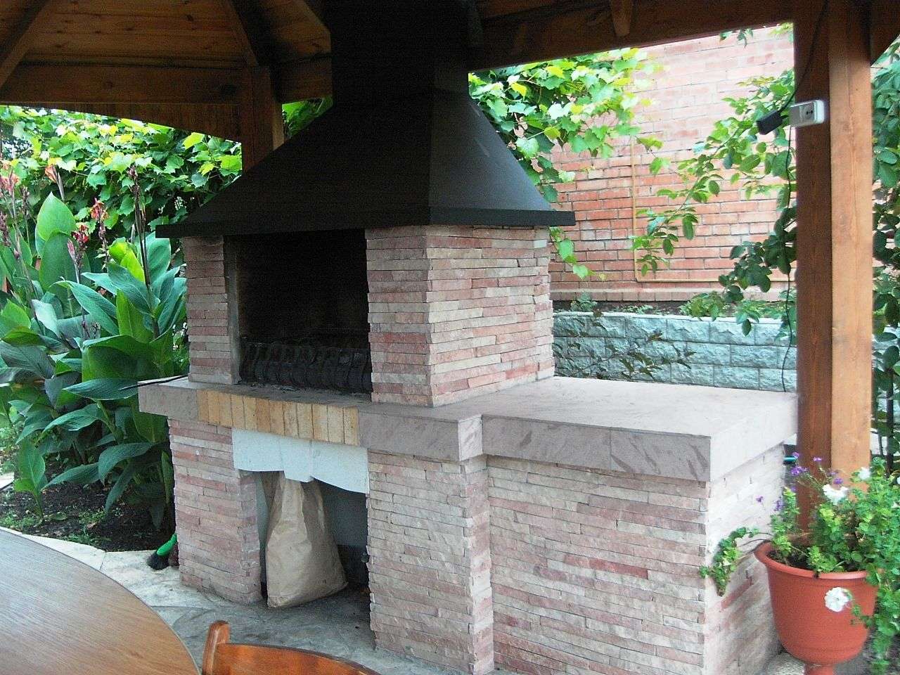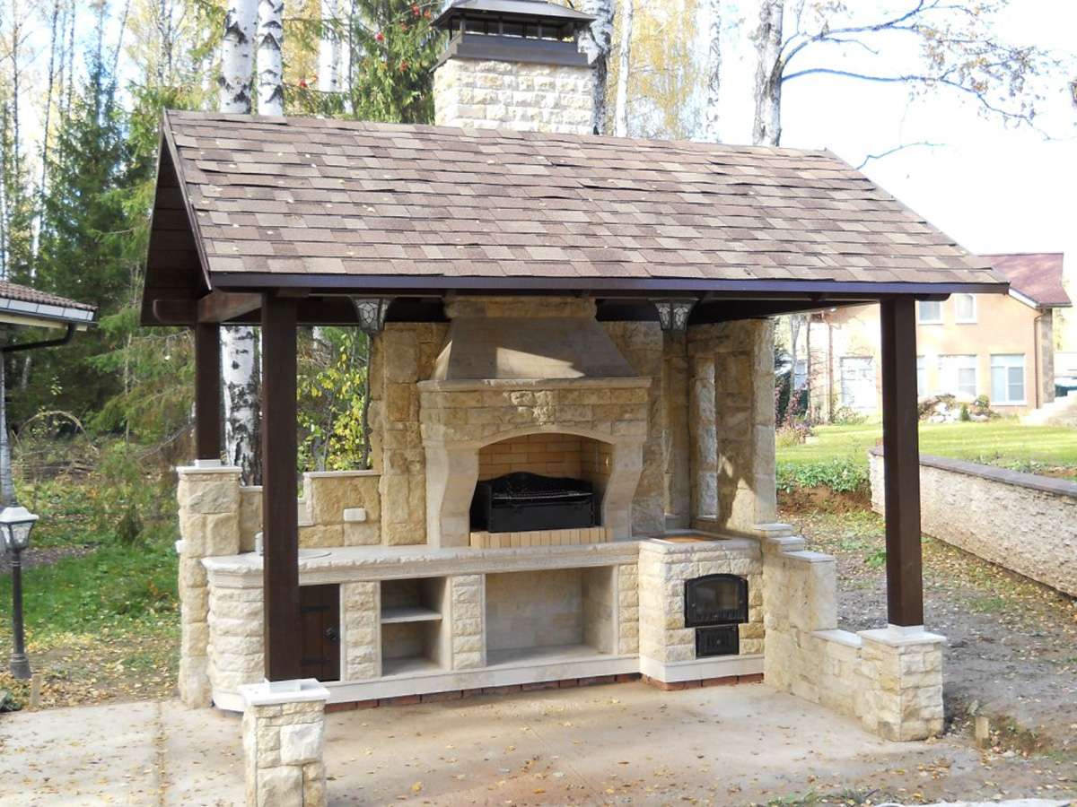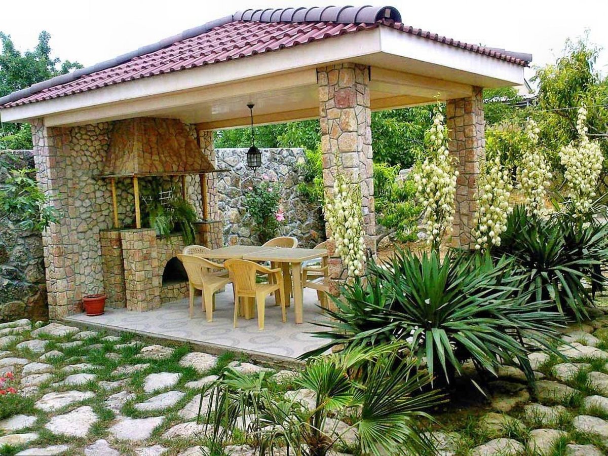 - Distância de casa. Se não estamos falando de um pátio onde tudo está claro, problemas podem surgir com a distância. Por um lado, não deve ser pequeno - caso contrário, logo que você tenha recolhido convidados, a fumaça pode entrar em casa. Por outro lado, não deve ser grande - caso contrário, você será atormentado trazendo comida da geladeira e levando embora os pratos sujos. Em geral, é melhor que seja mais do que menos - você não fará nada com a fumaça, mas os convidados ajudarão a transportar as coisas.